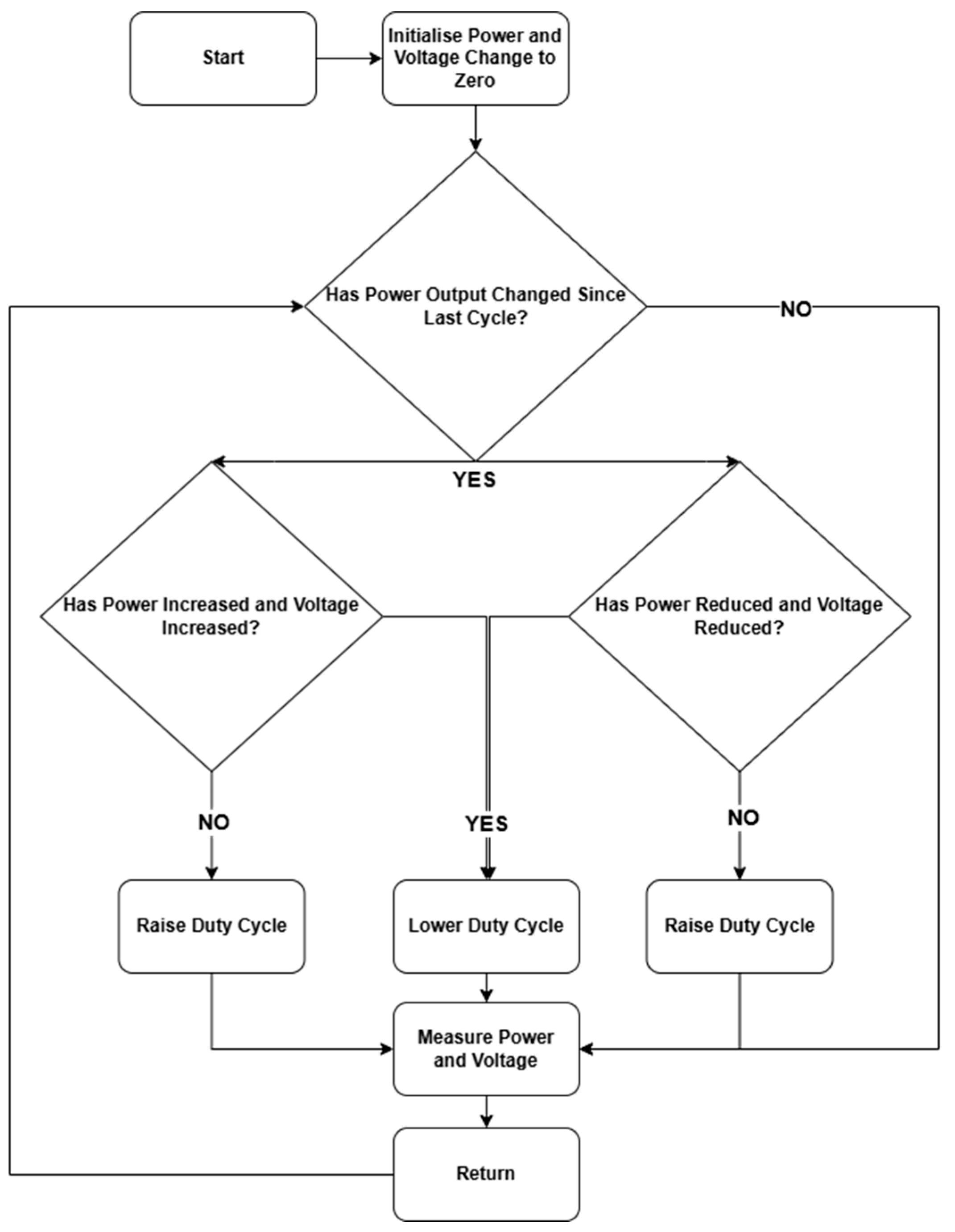 In a single execution cycle of the programme, the algorithm reads the current power output and compares it to the voltage and power of the previous cycle. Using this information, a nested if-else decision process implements the following P&O logic.