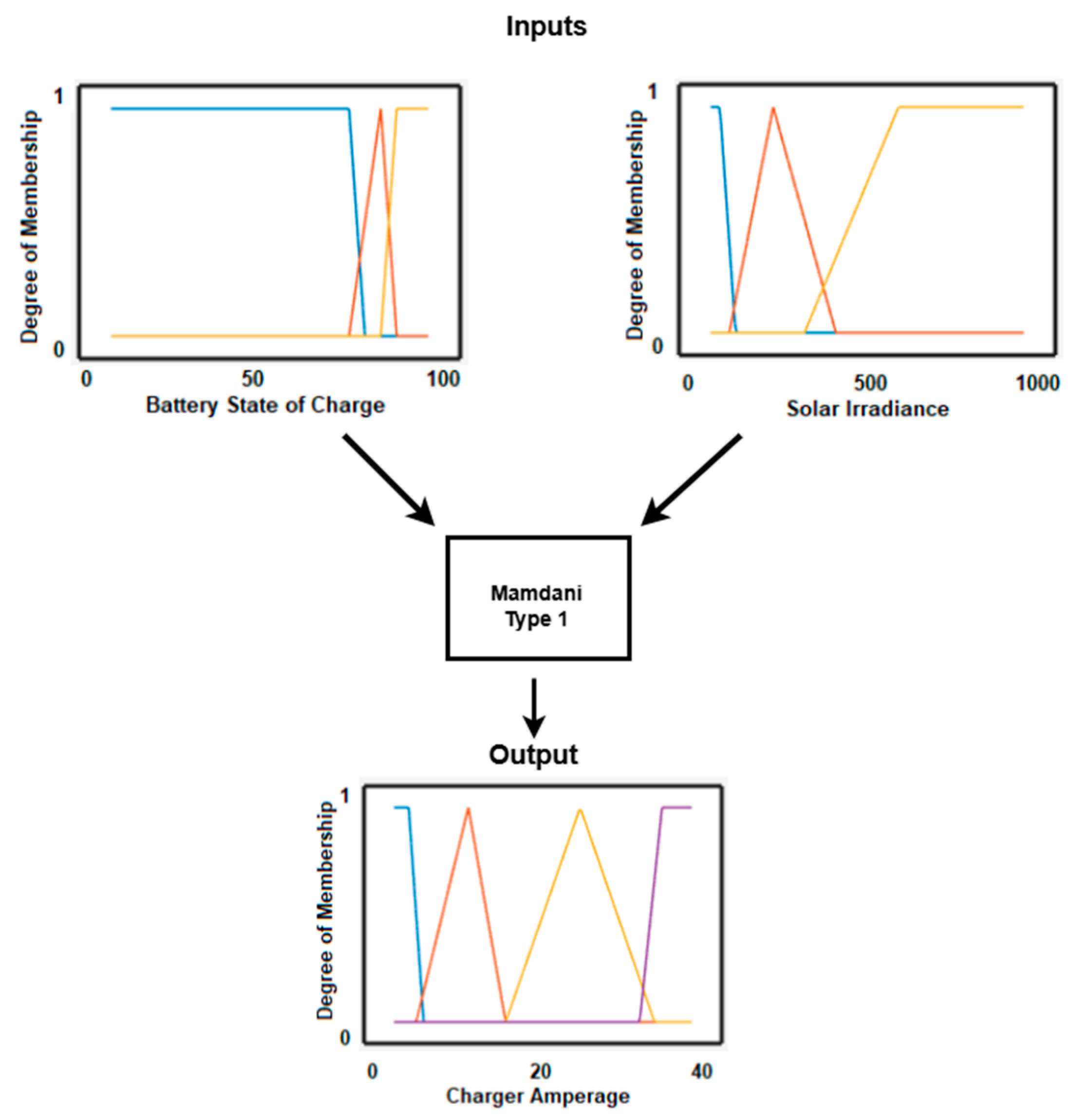 The selection of input variables for the fuzzy logic controller was guided by their direct influence on auxiliary battery charging requirements. The battery state of charge is critical to ensure the battery is neither overcharged nor excessively depleted, while solar irradiance reflects the available energy from the VIPV system. These inputs were classified into low, medium and high categories to capture the practical operating ranges observed in Australian driving conditions and PV output variability. The output variable, charger amperage, was chosen to provide fine-grained control over energy transfer from the traction battery to the auxiliary battery, maintaining battery health and maximising solar utilisation. The fuzzy rule base was constructed to prioritise charging when the SOC is low and/or solar availability is high, while reducing or halting charging when the battery is near full or solar input is insufficient. This approach balances energy efficiency, battery longevity and responsiveness to changing environmental conditions, ensuring adaptive and robust system performance under dynamic real-world scenarios.