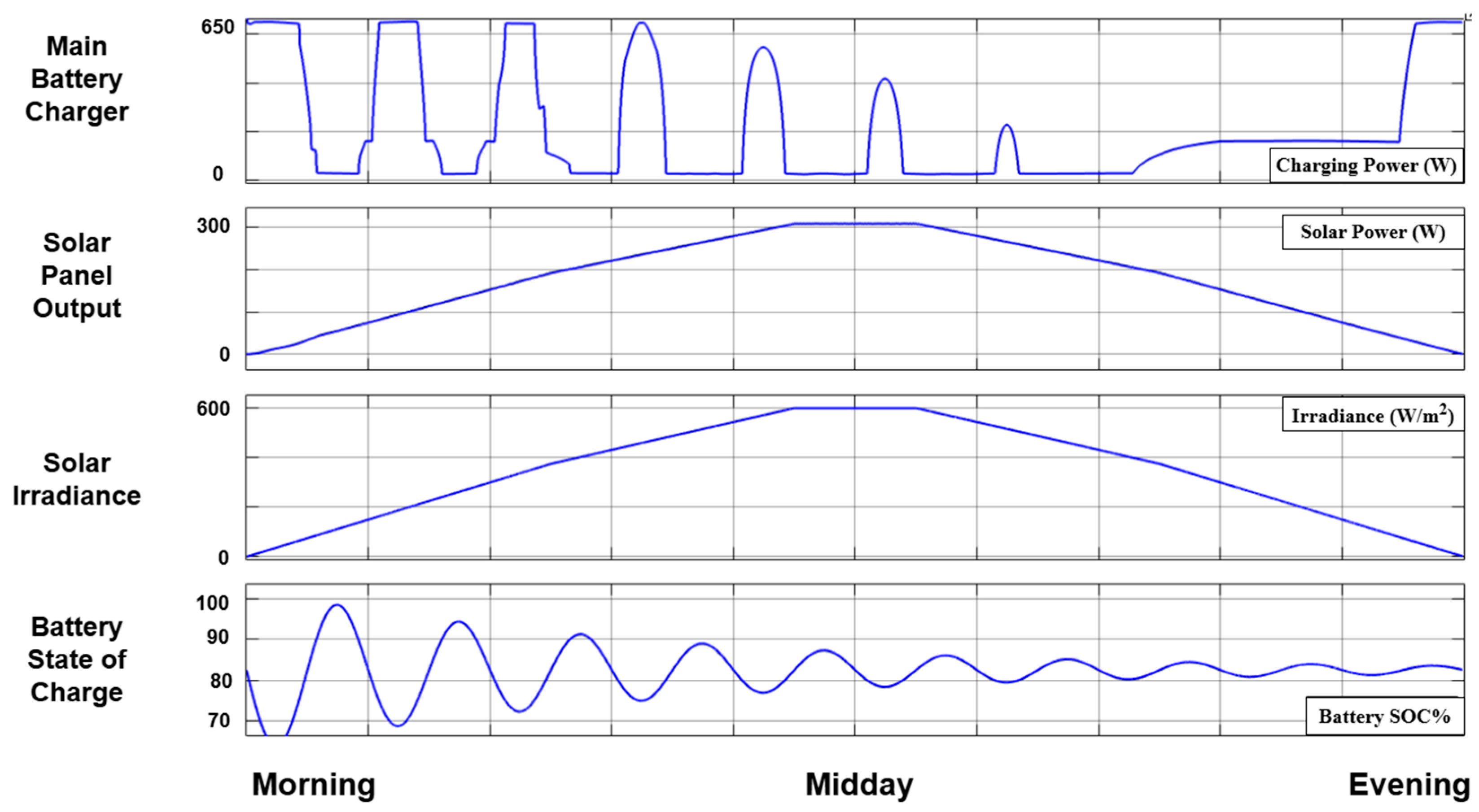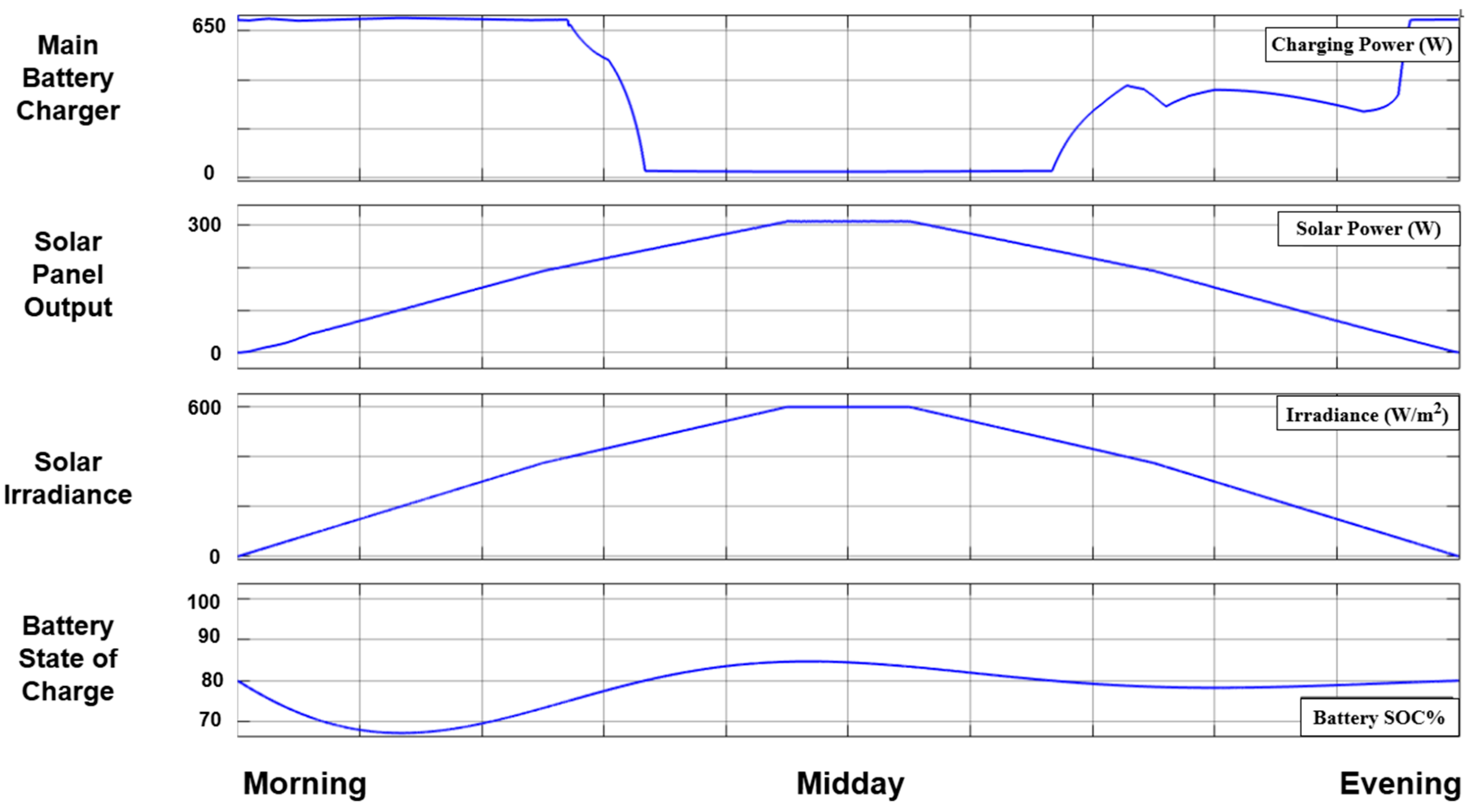 Figure 6 illustrates the charger’s intelligent response to these rapid fluctuations under varying irradiance. In the early morning, steep reductions in the state of charge trigger a strong response from the charger to maintain operational readiness. Around midday, the fuzzy logic controller adjusts output more conservatively, ensuring that the charger supports the battery without competing with the increasing solar contribution. Again, this prevents unnecessary grid draw and prioritises solar utilisation. By late afternoon, as irradiance decreases, the controller shifts emphasis back to the charger, which resumes primary responsibility for maintaining battery stability. This adaptive control approach ensures optimised energy flow, maximises solar usage and enhances the overall system efficiency under realistic operating conditions. These results confirm the system’s resilience to fluctuating energy demands. Adaptive control ensures optimal energy flow and battery stability.