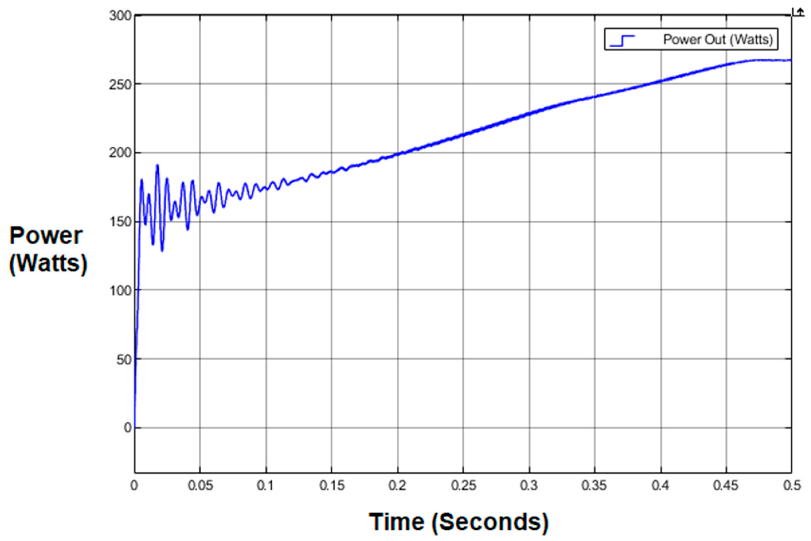 Figure 7 illustrates the transient response of the P&O MPPT algorithm when subjected to a step change in irradiance. The controller rapidly converges to the maximum power point, with oscillations significantly damped within approximately 0.15 s and full stabilisation achieved by 0.5 s. Relative to the results reported in [