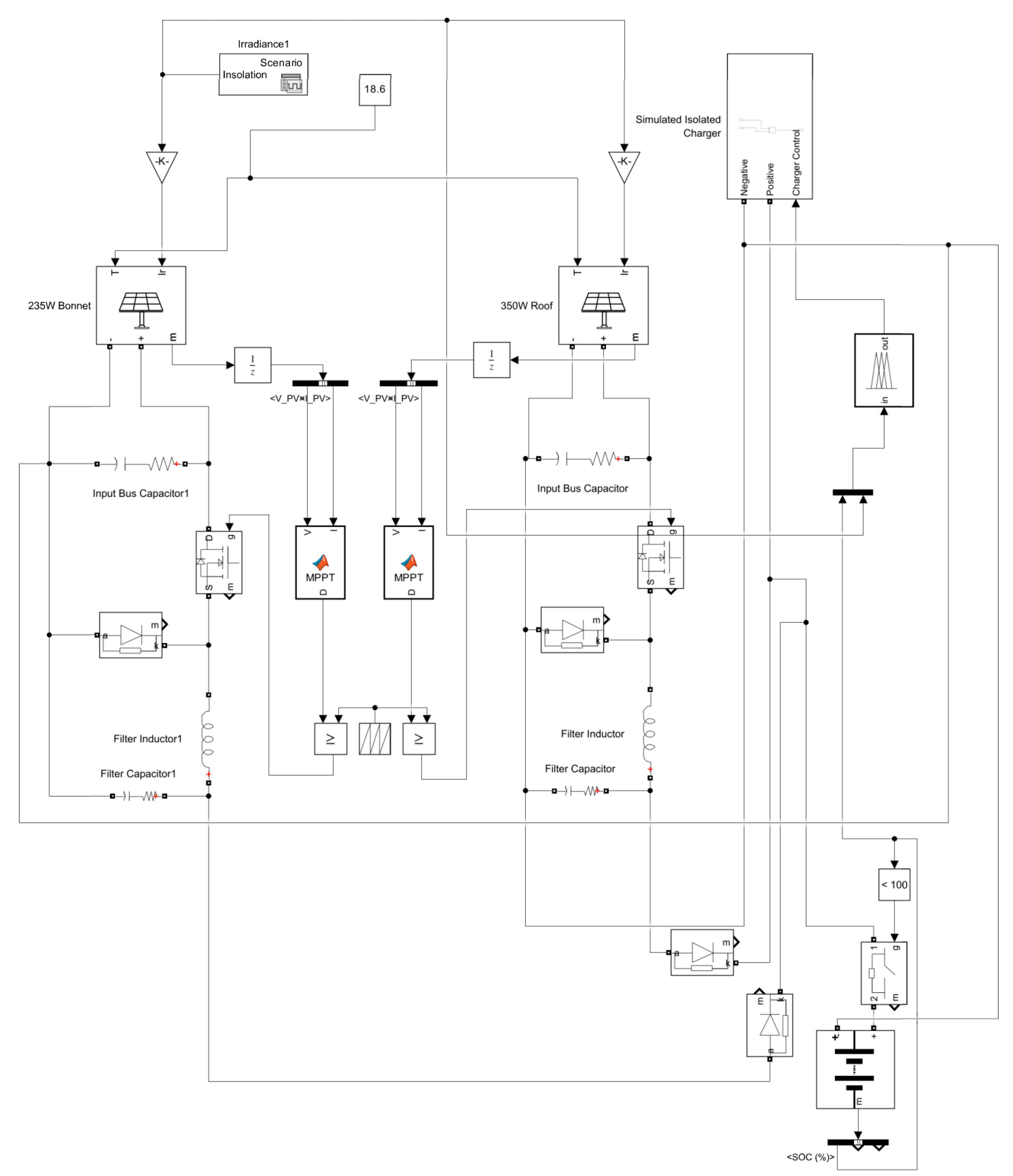 Within MATLAB/Simulink, two separate solar arrays are used to simulate the PV panels mounted on the roof and bonnet of the vehicle, each configured to represent a single panel. The simulation time step was set to 1 × 10
