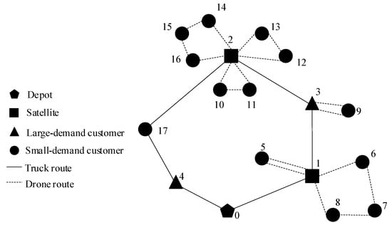 The Two-Echelon Location Routing Problem (2E-LRP) [,,] is also similar to the FMTDJRP. It has a stricter two-level structure than the TTRP and the FMTDJRP. Large vehicles operate on the upper-level route and deliver goods to the satellites. Small vehicles pick up the goods at each satellite, distribute them to customers, and then return to their starting satellite, forming the lower-level routes. The sequence of nodes visited on each level is optimized independently in the 2E-LRP but in an integrated way in the FMTDJRP. This is because the upper-level route of the FMTDJRP passes through more than one type of node, including satellites and customers, whereas the 2E-LRP does not.