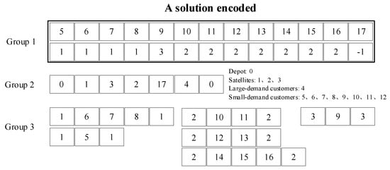 - Group 2: This group is a one-tier array representing the truck route. All large-demand customers must appear in this array. Satellites and small-demand customers may appear in the truck route, but their presence is not mandatory. The array starts and ends with the depot index.