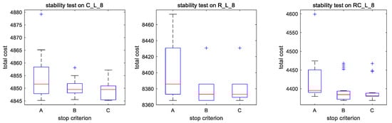 Criterion A performs well on all the instances with up to 60 customers. Therefore, three criteria were tested on all the instances with 100 customers. For each instance, the metaheuristic was run for 20 times with every stop criterion. The test results of the largest instances, which are C_L_8, R_L_8, and RC_L_8, are shown in Figure 6.