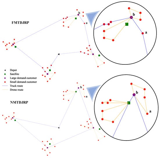 One can find that the gaps are all positive, which means whenever a full solution is obtained, the FMTDJRP solution is always cheaper than the NMTDJRP solution. This can be explained by Figure 10 the solutions of the FMTDJRP and the NMTDJRP to C_L_2 with drone feature combination 3. In the NMTDJRP solution, all small-demand customers are visited by drones. This task allocation strategy can indeed reduce the distance traveled by the truck so as to reduce the total cost but not always. For example, the cost of adding customer a into the truck tour is +3.10. In the meanwhile, the cost of removing customer a from the drone tour connected to large-demand customer b (functioning as a rendezvous node here) is −10.56. Consequently, a cost saving of 7.46 is created. To conclude, this adjustment can help reduce the total travel cost in the way of preventing the angle between the routes of two vehicles from being to small.
