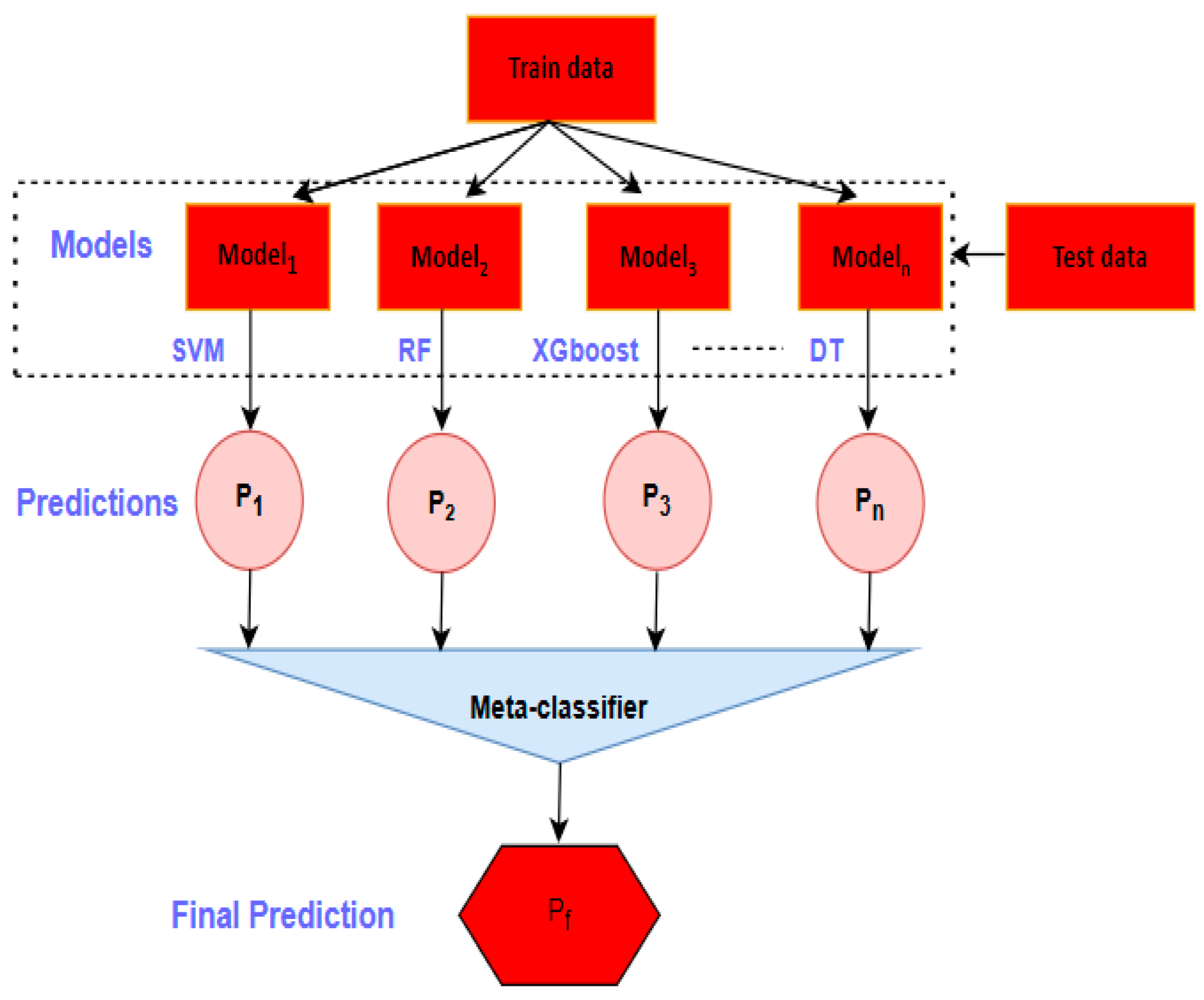 where σ is the logistic activation function. The weights w j are learned by minimizing the cross-entropy loss between y ^ and y . This formulation underlies the stacking process used in our ensemble architecture.