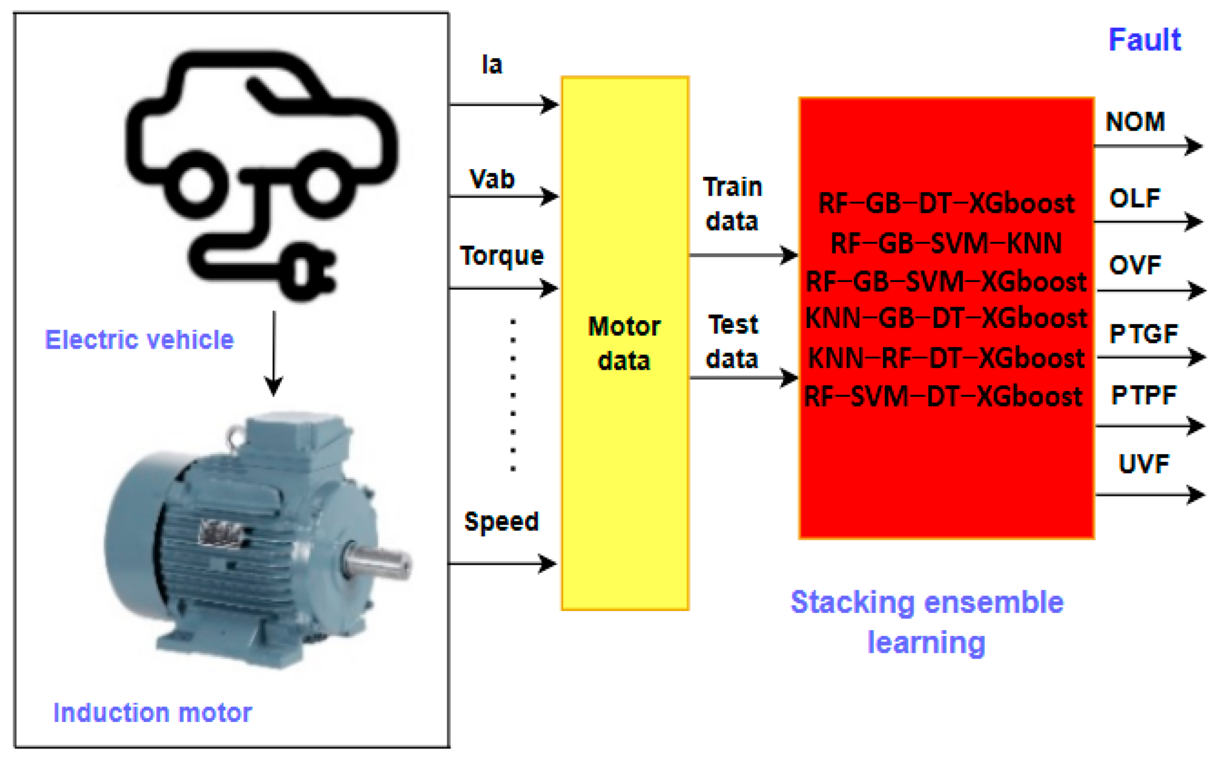 Induction motors are considered a mainstay in the economic and industrial sectors, as they are used in the assembly of EVs due to their many advantages, including durability and hardness in different operating conditions. However, they are vulnerable to various malfunctions that affect their quality, especially in phase, overloading, and voltage [11]. The induction motor is exposed to many faults that affect the quality of work. Therefore, advanced techniques are used to detect these faults and classify them. Using data that represents various fault scenarios, stacking ensemble learning and machine learning algorithms are two crucial algorithms in this context [12,13].