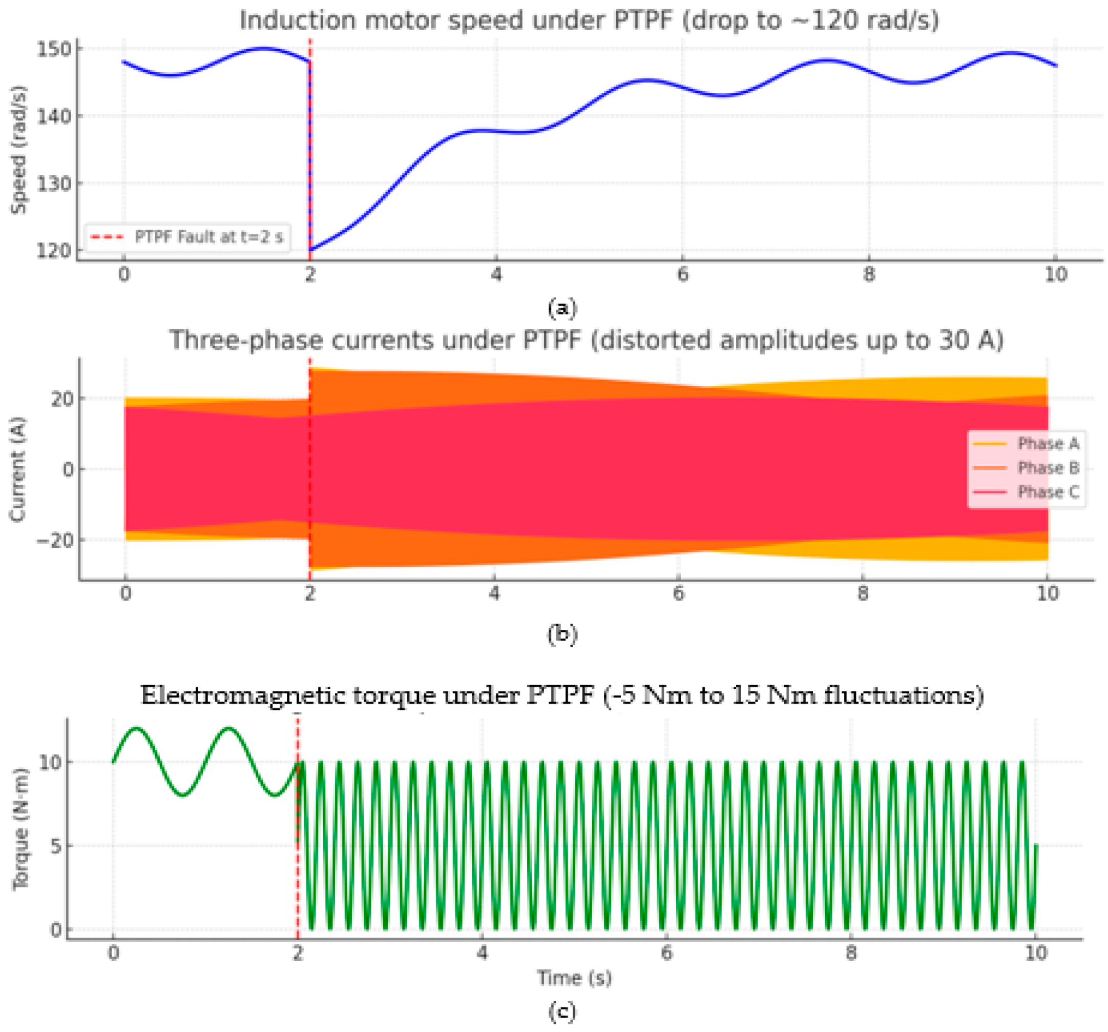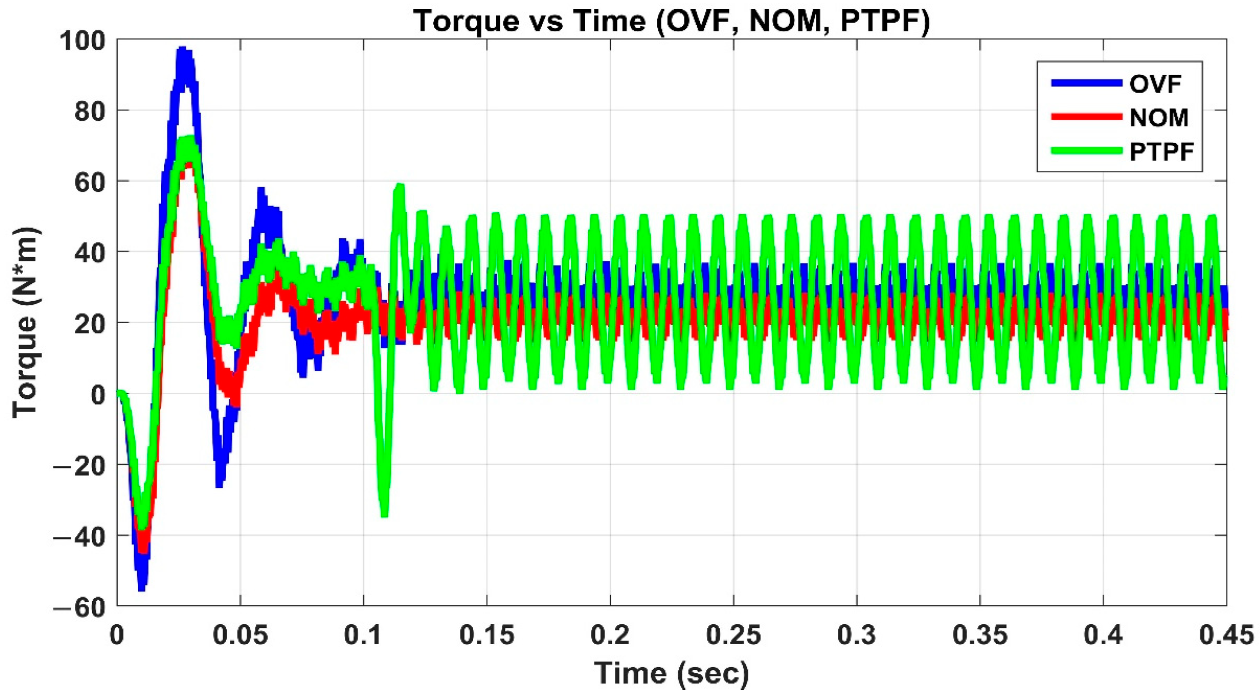 Figure 5 shows the speed of the induction motor in the NOM, OVF, PTPF state, reaching 148 rad/s when the motor is in normal operation, but at PTPF, it is 130 rad/s. Figure 6 shows the three currents used to operate the motor in MATLAB, with all three values reaching a threshold of 20 A. Figure 7 shows the electromagnetic torque extracted from the motor in the NOM, OVF, PTPF state; we note that there is a difference in values according to each case.