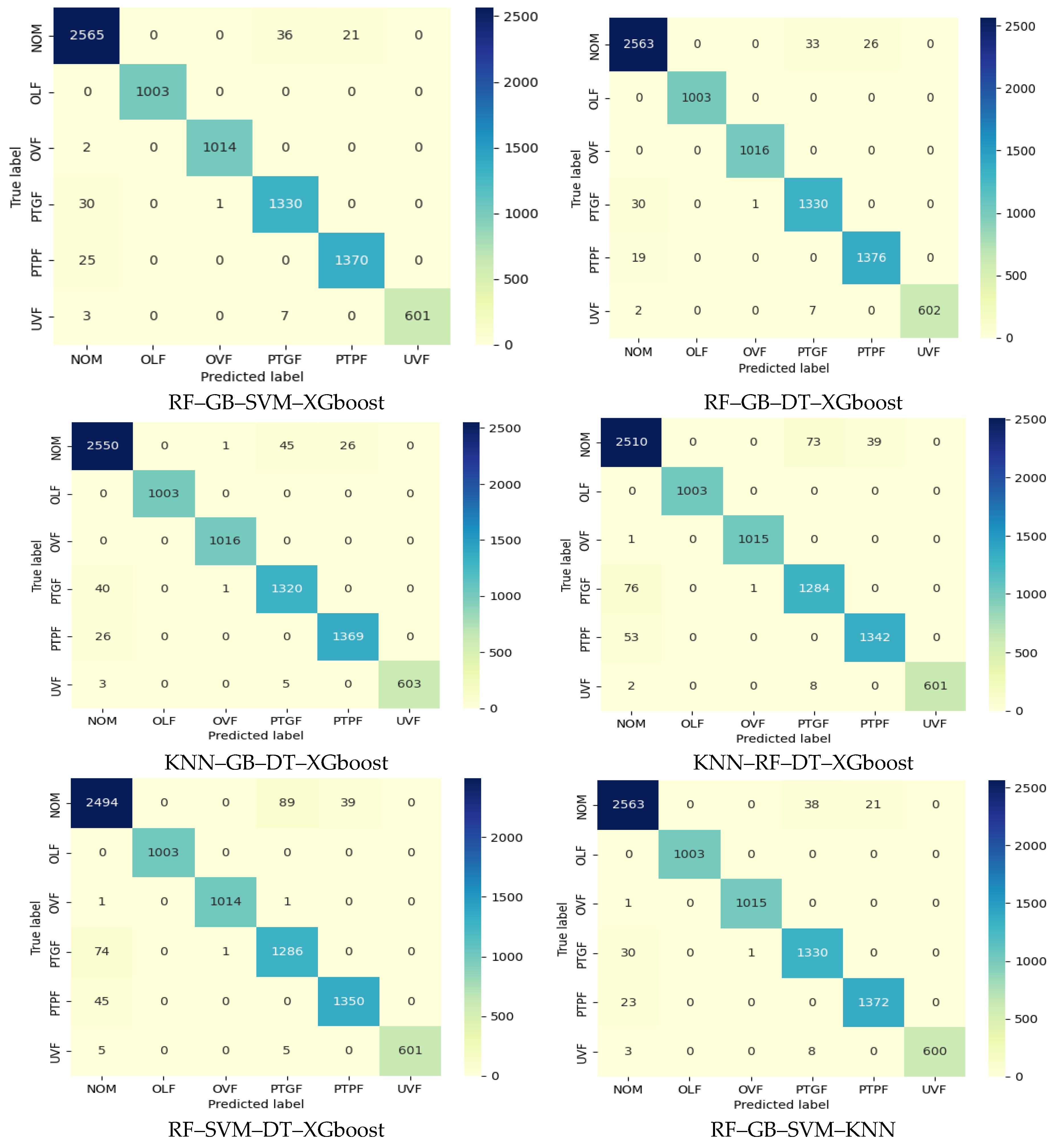 Table 3 presents a summary of the data counts for the different operating and fault conditions of the induction motor. NOM is represented by 13,013 data samples, while the fault conditions include OLF and OVF, with 5005 samples each; PTGF and PTPF, with 7007 samples each; and UVF, with 3003 samples. This distribution shows that the dataset is balanced to cover different fault scenarios. In order to use machine learning and stacking ensemble learning in fault classification, a total of 40,040 data were extracted. The data was divided into 80% training and 20% test.