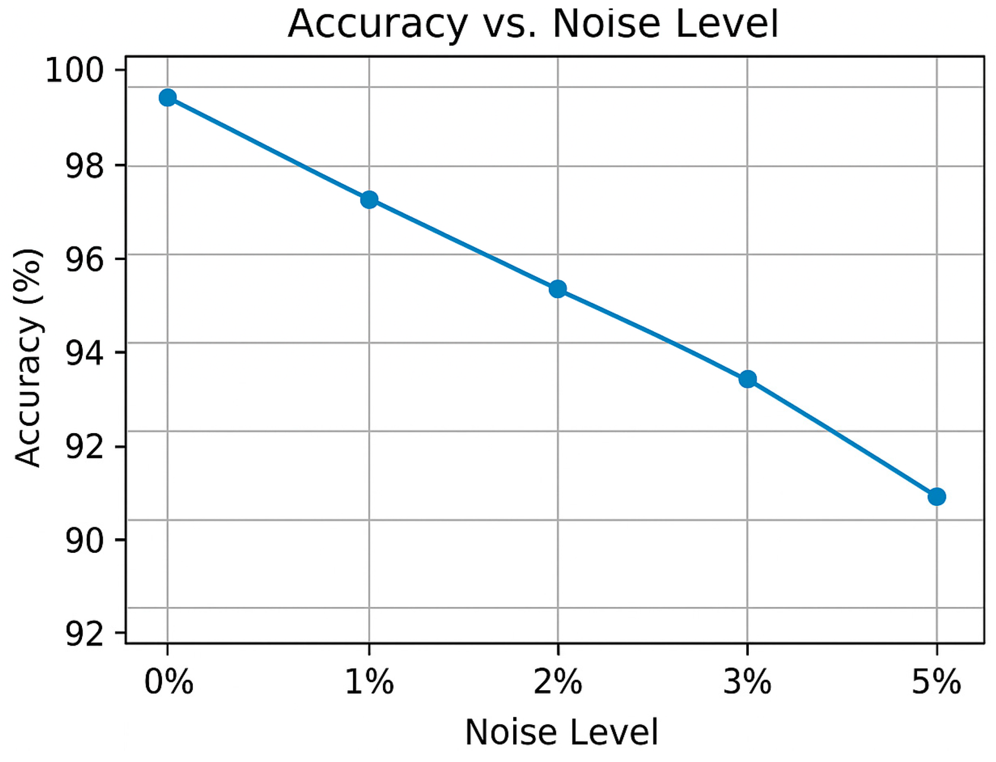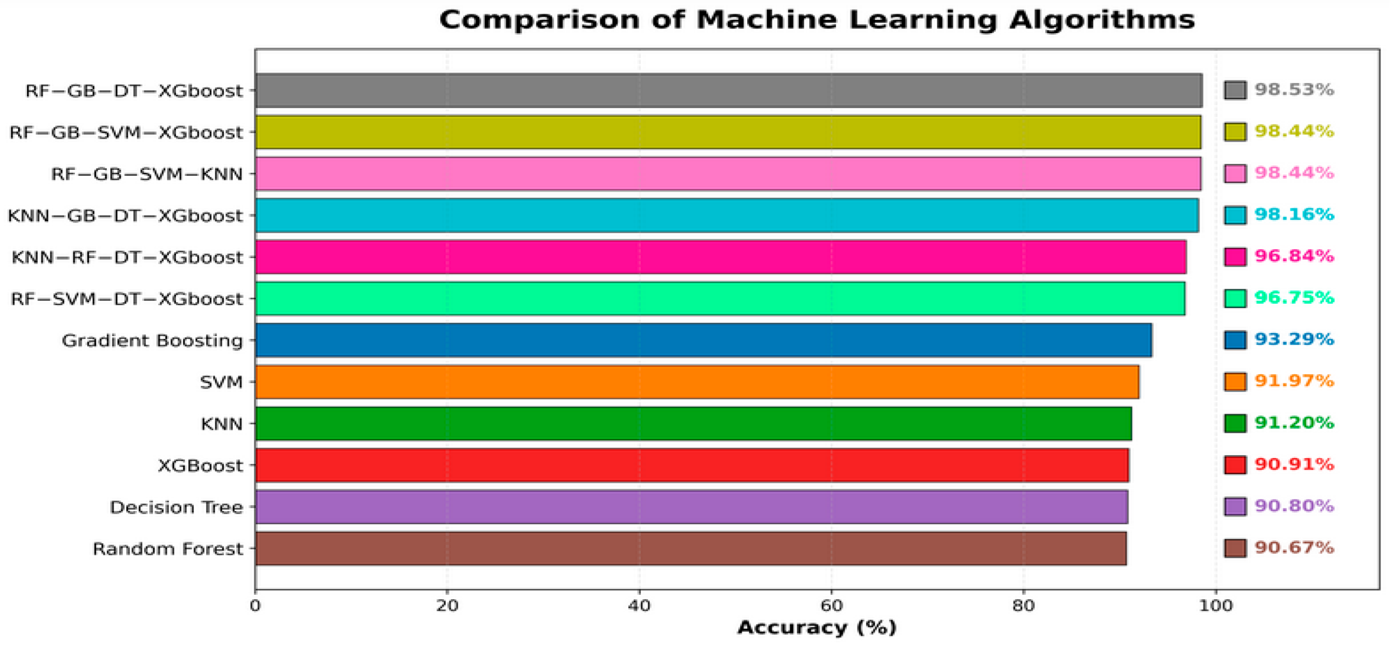 The meta-classifier employed in this study is a logistic regression model with L2 regularization (penalty = ‘l2’, C = 1.0, solver = ‘lbfgs’). This algorithm integrates the probabilistic outputs of the base learners (RF, GB, DT, XGBoost) to compute the final classification. Logistic regression was selected after comparing alternative meta-learners (Linear SVM, Random Forest), achieving the highest validation accuracy (98.53%) with balanced precision–recall performance. Hyperparameter tuning was conducted using 5-fold cross-validation.