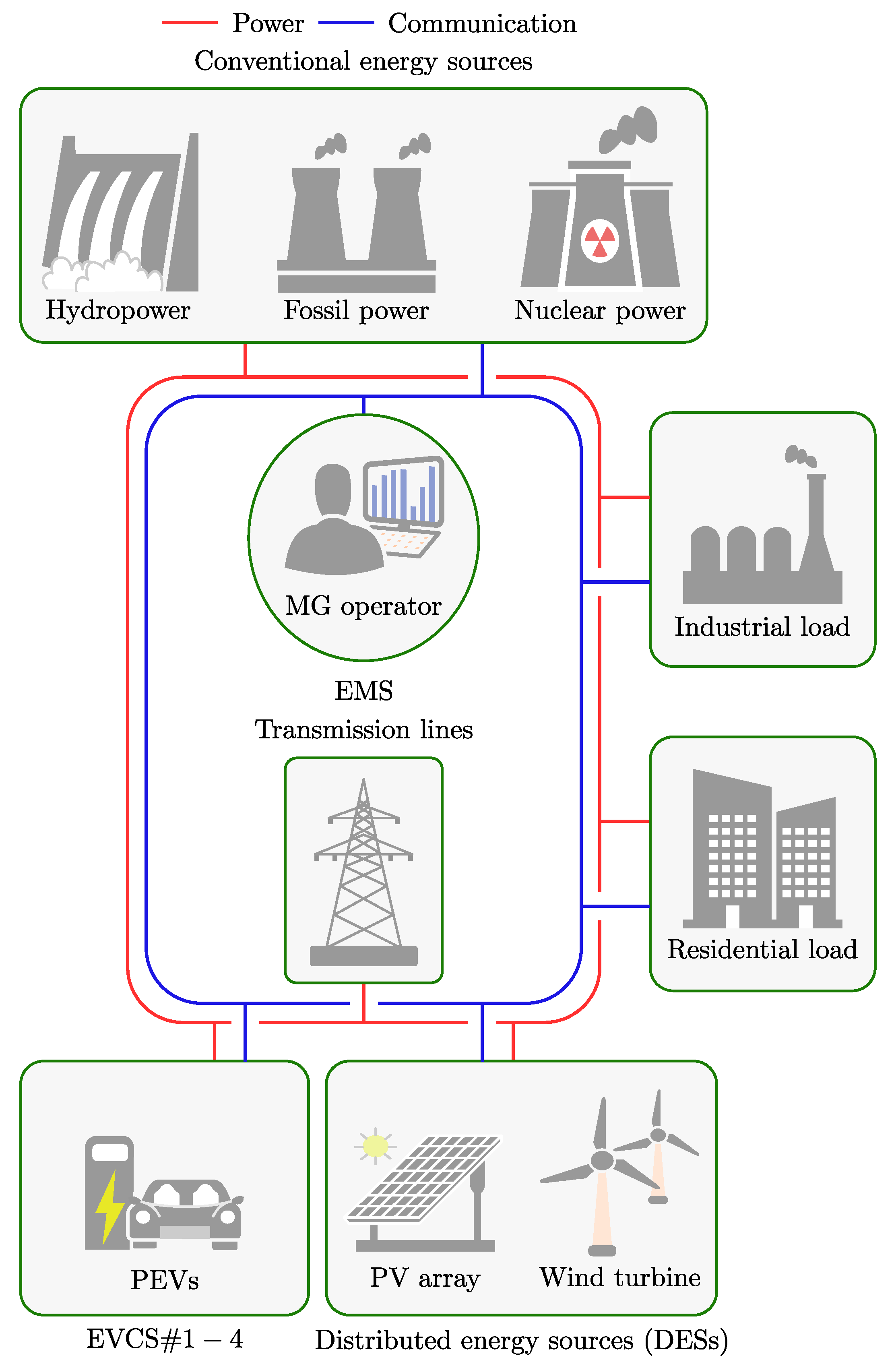 Figure 1). PV and wind sources are considered distributed energy sources (DESs). The system aims to minimize grid electricity consumption by utilizing local renewable generation and storing surplus DES power in EV batteries through vehicle-to-grid (V2G) operation.