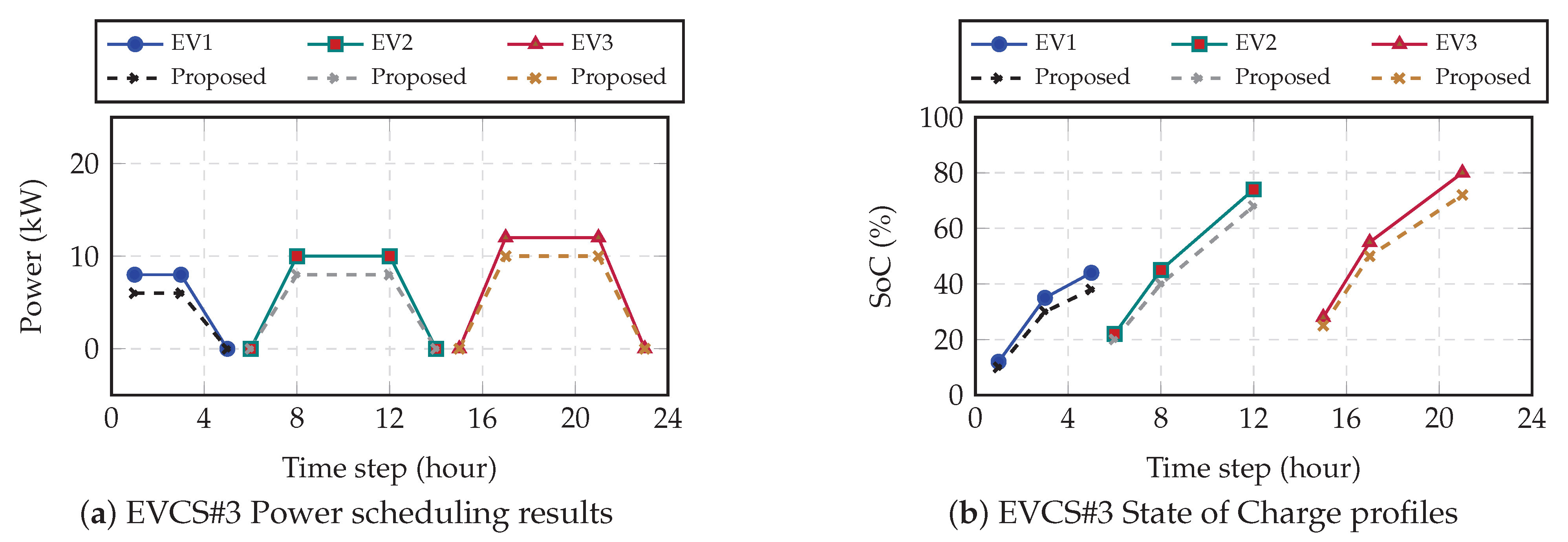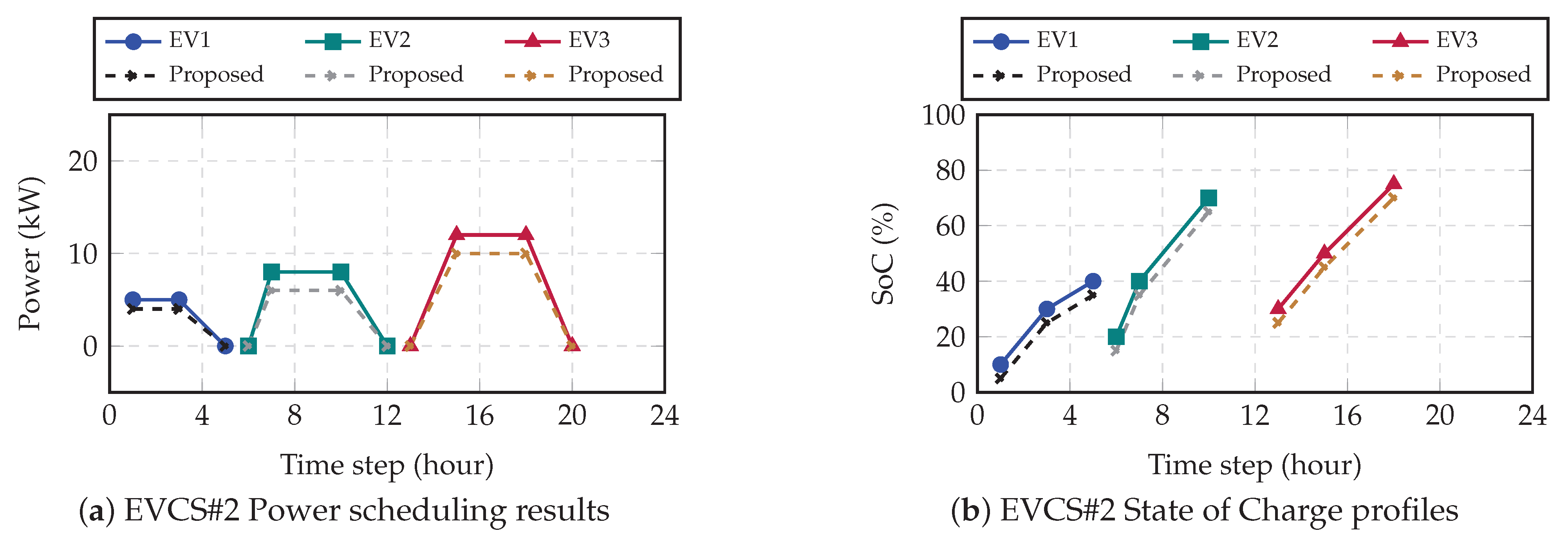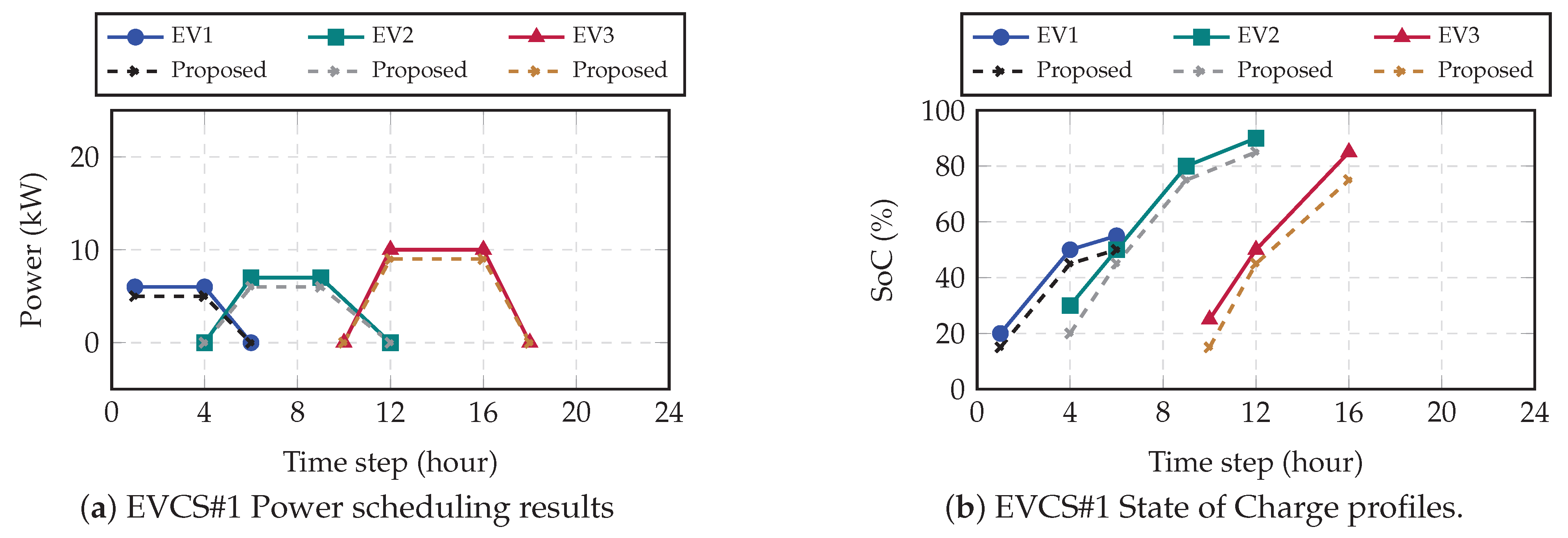 | EVCS | EV | (kW) | Battery Capacity (kWh) | Initial SoC (%) | Baseline Final SoC (%) | DHO Final SoC (%) |
