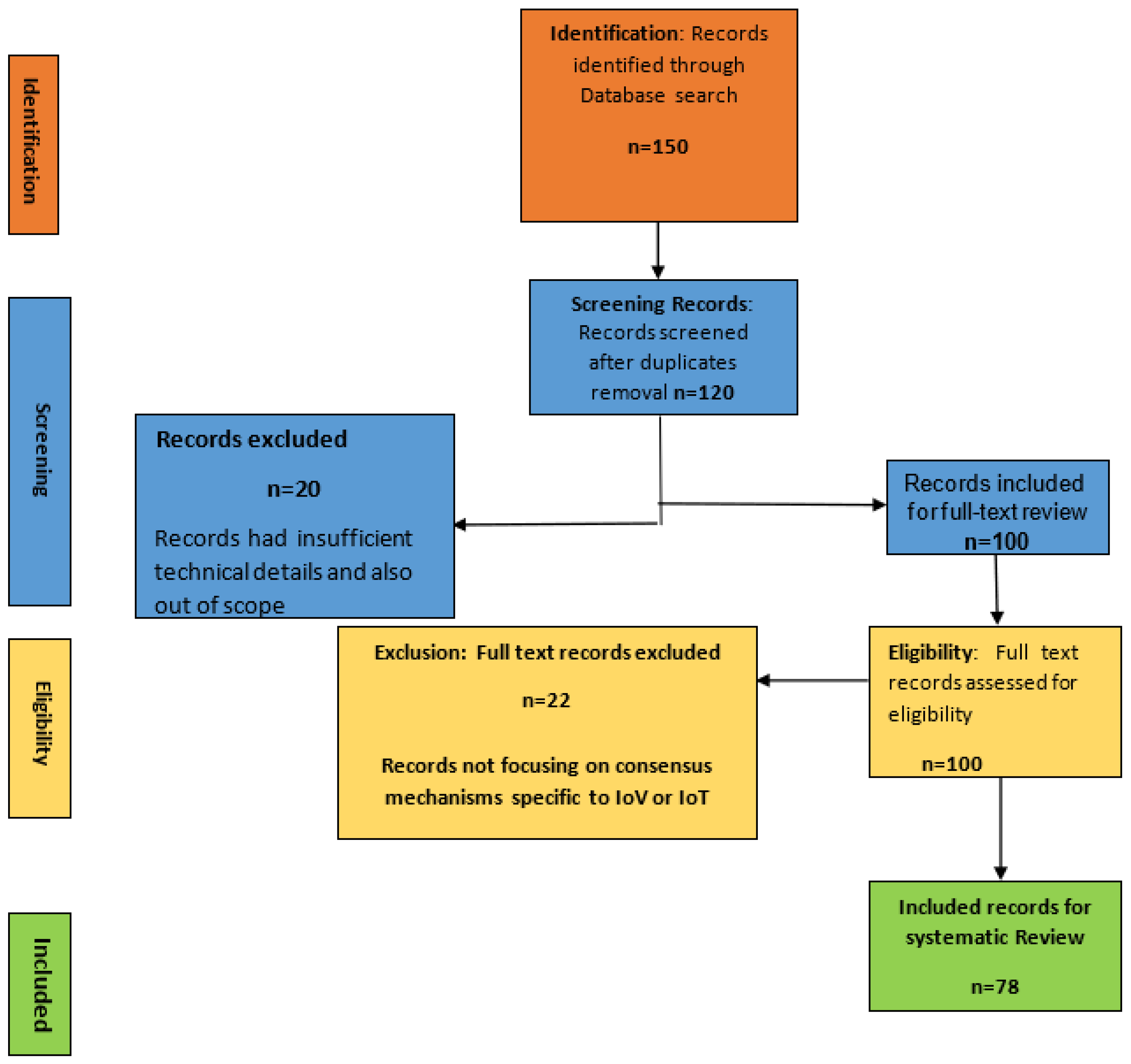 | [1] | Blockchain for IoV | Partial | Lacks consensus level comparison feature bench marking | Establishes a PRISMA-based IoV-specific framework that systematically evaluates consensus mechanisms beyond general blockchain discussion. |