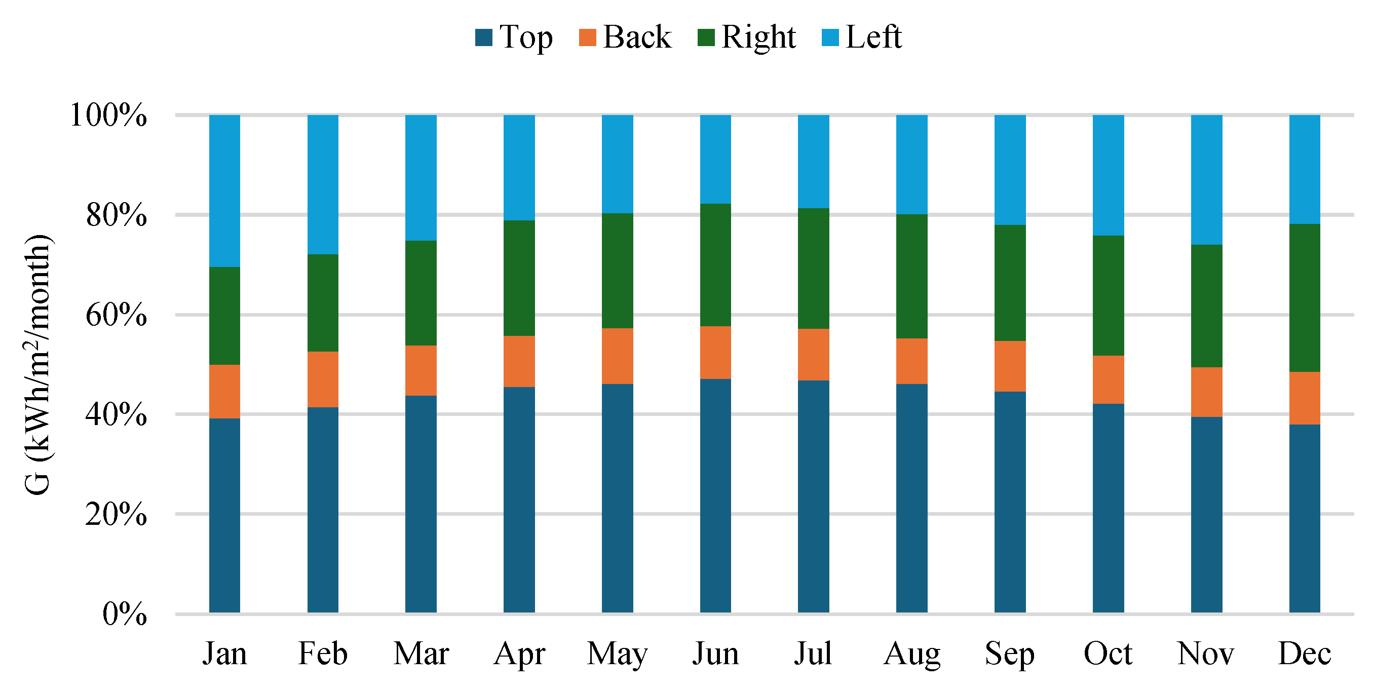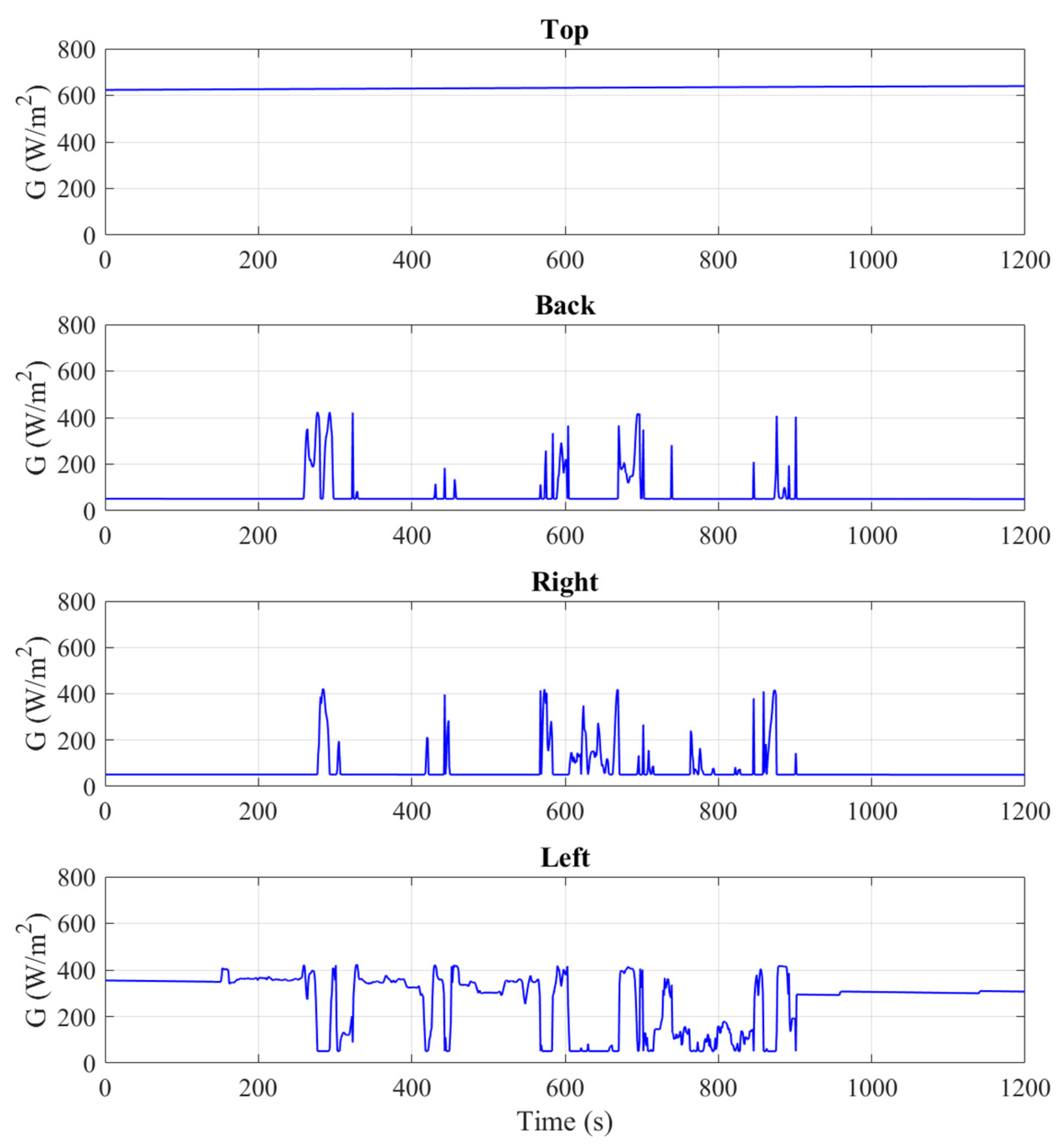 - Wetzel, G.; Salomon, L.; Krügener, J.; Bredemeier, D.; Peibst, R. High time resolution measurement of solar irradiance onto driving car body for vehicle integrated photovoltaics. Prog. Photovolt. Res. Appl. 2022, 30, 543–551. [Google Scholar] [CrossRef]