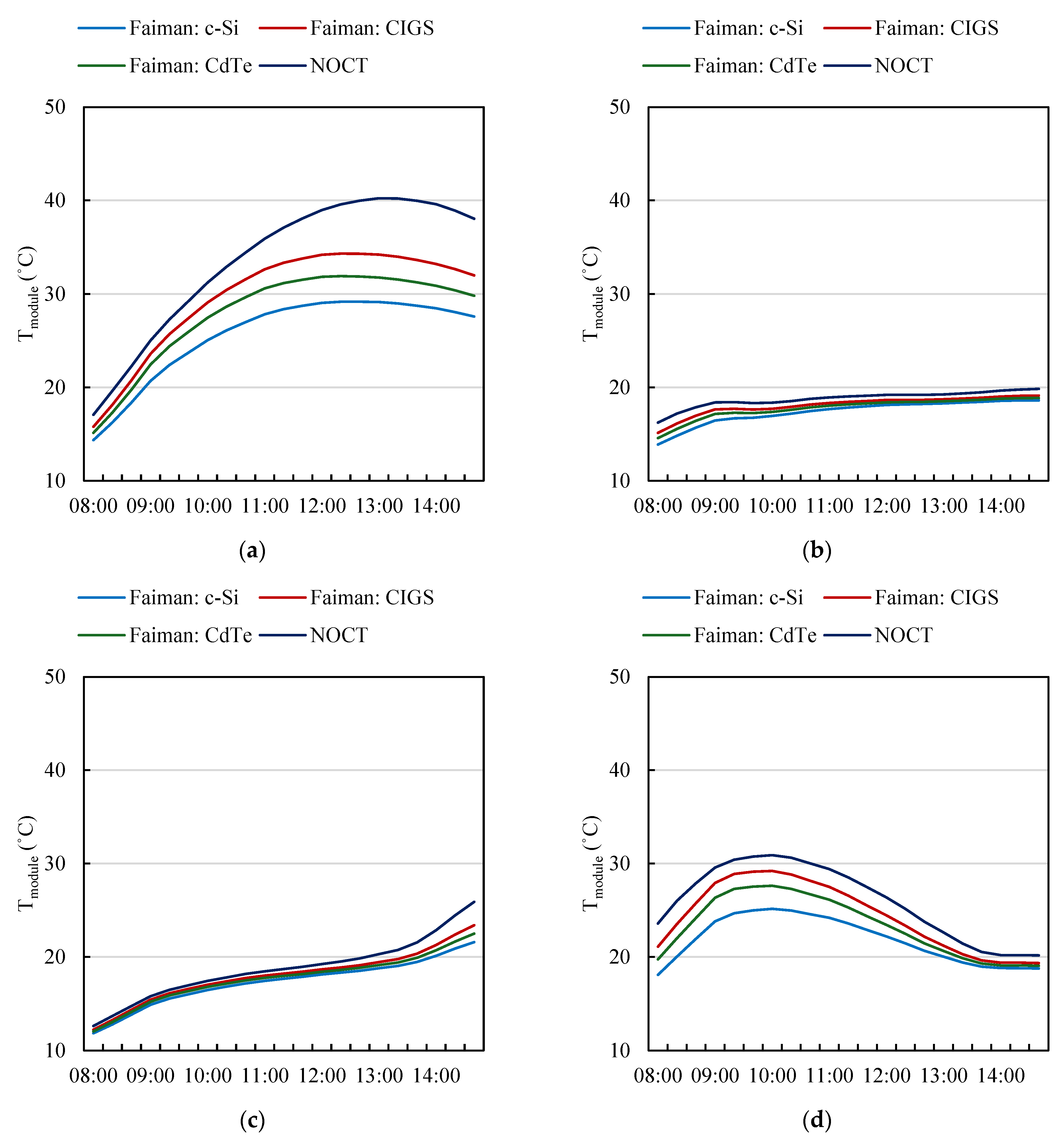 - Faiman, D. Assessing the outdoor operating temperature of photovoltaic modules. Prog. Photovolt. Res. Appl. 2008, 16, 307–315. [Google Scholar] [CrossRef]