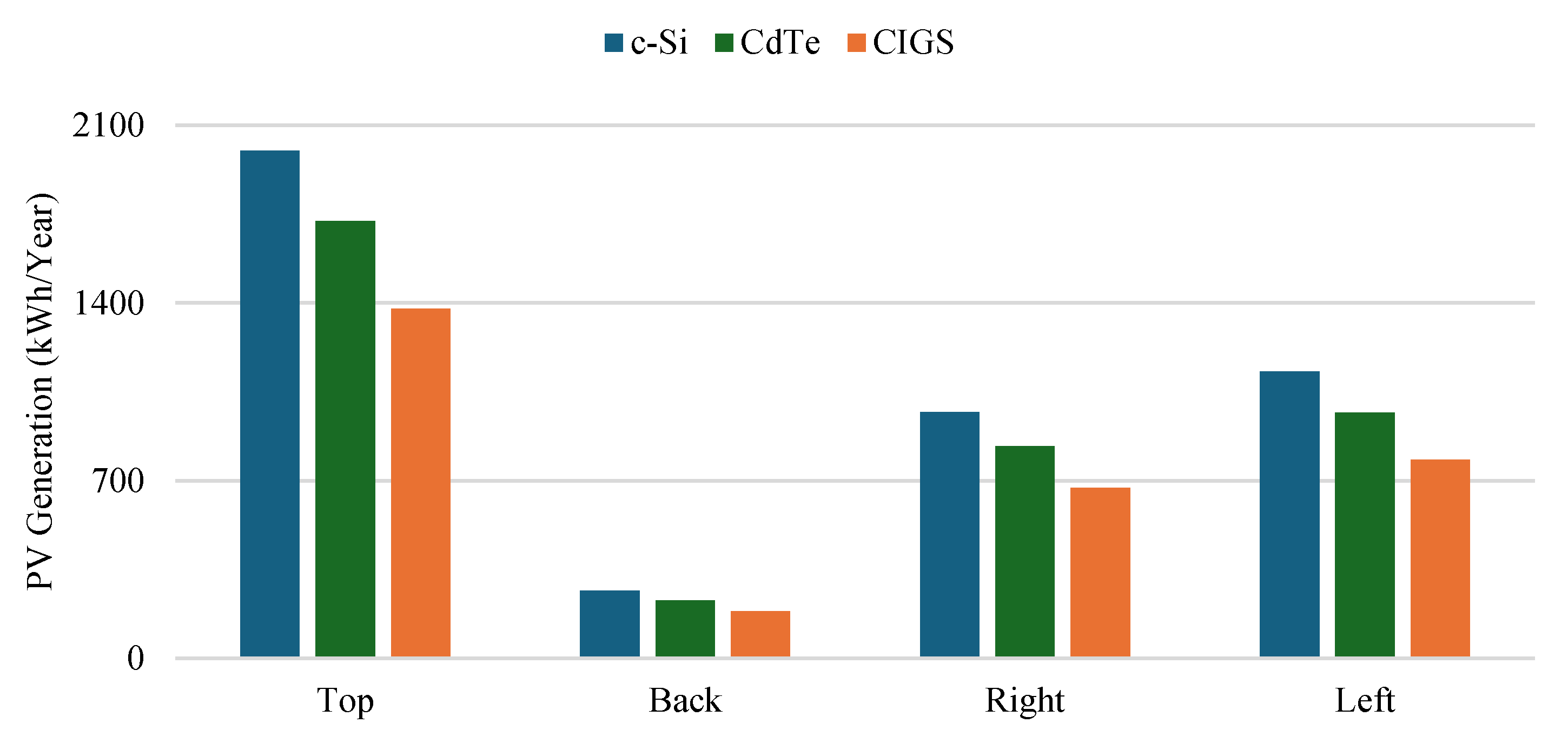 - Golubev, T.; Lunt, R.R. Evaluating the Electricity Production of Electric Vehicle-Integrated Photovoltaics via a Coupled Modeling Approach. In Proceedings of the 2021 IEEE 48th Photovoltaic Specialists Conference (PVSC), Fort Lauderdale, FL, USA, 20–25 June 2021; IEEE: New York, NY, USA, 2021; pp. 0155–0159. [Google Scholar] [CrossRef]