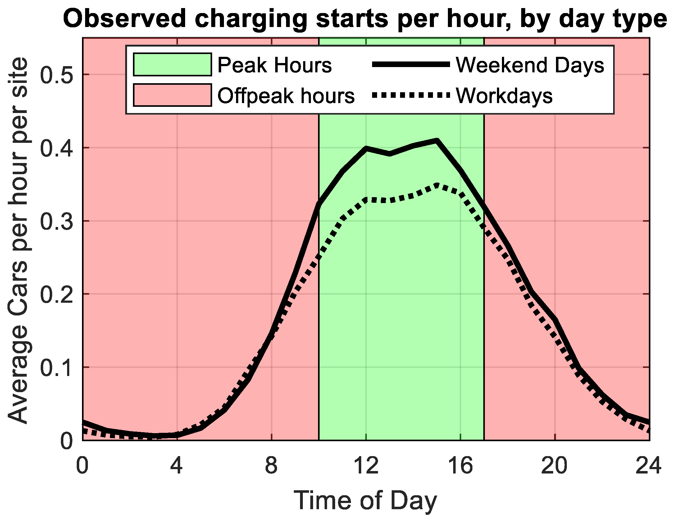 - This is evaluated probabilistically based on the hour of the day and the day type (weekday or weekend day). These probabilities, observed from source data (see Section 3.1), are multiplied by a range of factors between 0 and 16 to produce representations of different site popularities between 0 and ~23,000 EVs seeking charging per year. Site popularity for each multiplication factor is defined as the number of vehicles found to arrive at the site per year at the end of the model run (i.e., the site popularity is observational, not prescriptive).