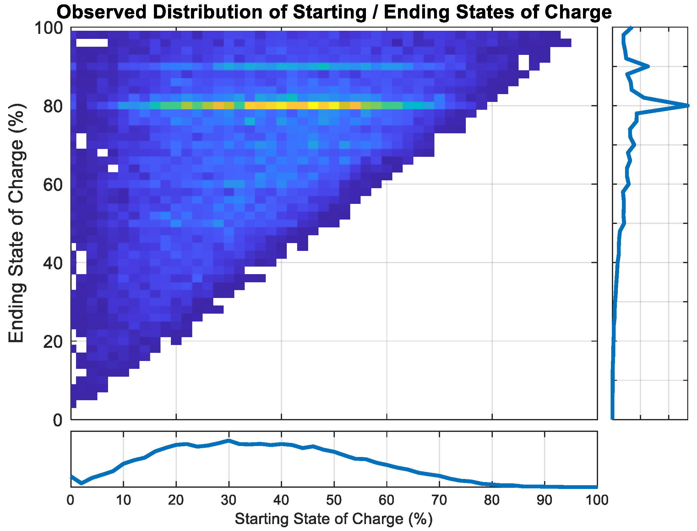 - Data suspected of reflecting a Plug-in Hybrid Electric Vehicle were excluded. These were identified by a small battery (less than 45 kWh), and in isolation, had a high prevalence of starting SoC values very near 0%. Such vehicles have generators/range extenders, and are able to completely deplete their batteries with no negative operational impacts. It was surmised that while such small-battery vehicles might charge at relatively low cost, low-power 50 kW units used as source data would be unlikely to charge at the higher-power, higher-cost 175 kW units being modeled, due to the inability of most hybrid models to make use of such high powers.