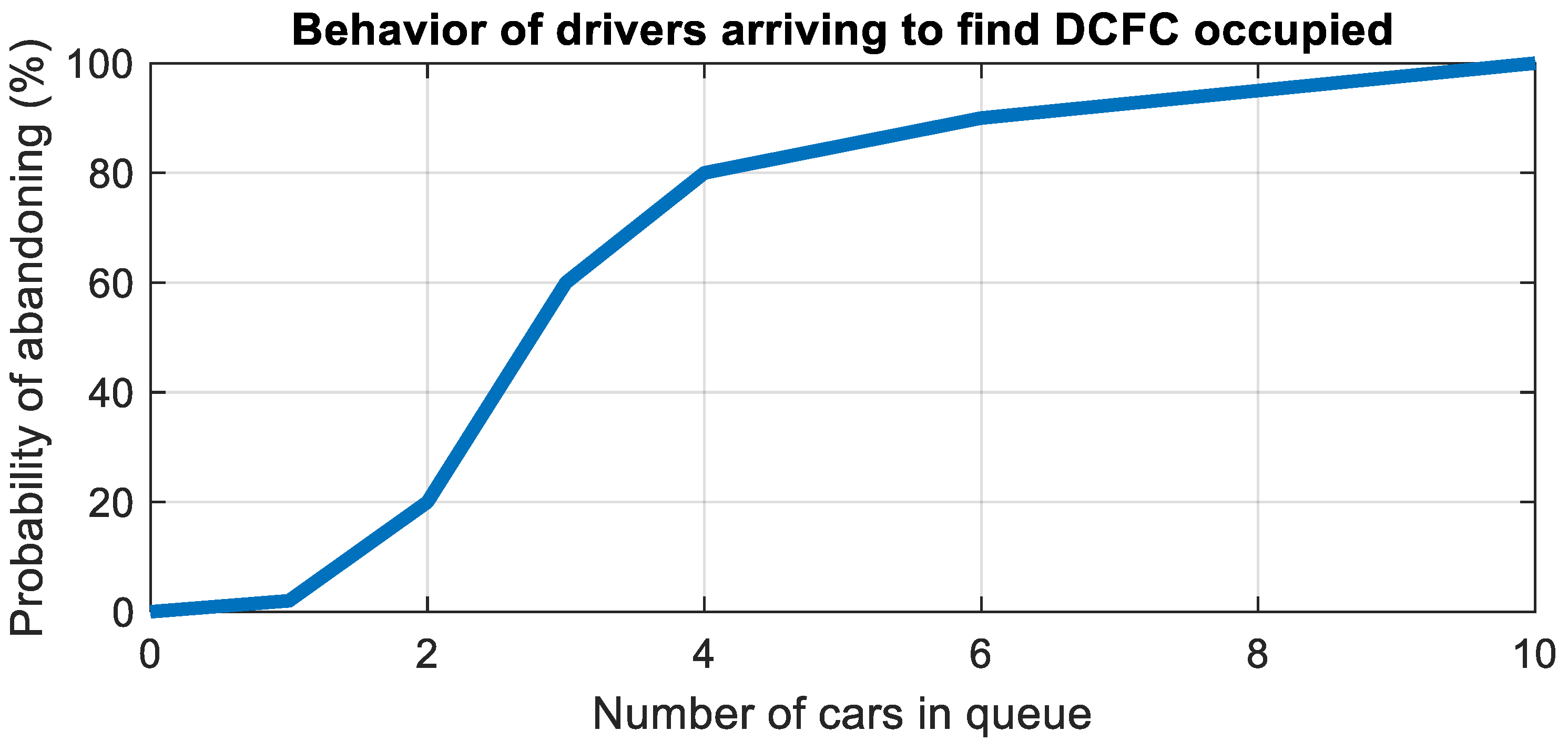 - Abandon charging; If a vehicle arrives and the cordset is occupied, there is a chance (described in Section 3.5) that it will abandon this attempt and move on to some other charger or destination (termed ‘balking’ in [29,37]). This is an incrementing integer.