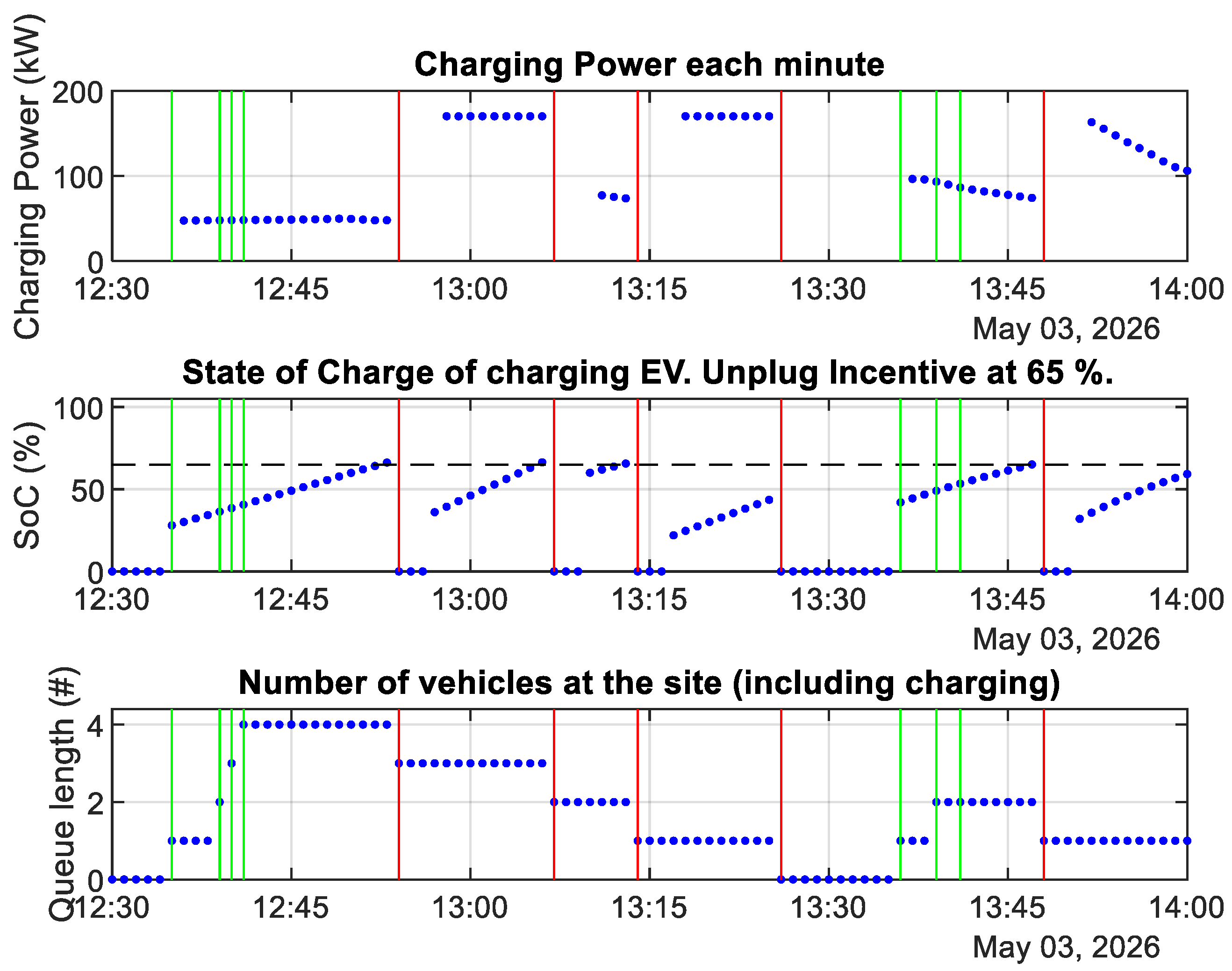 - Queue Lengtht is a timeseries vector tracking how many vehicles are at this site, including the one charging.