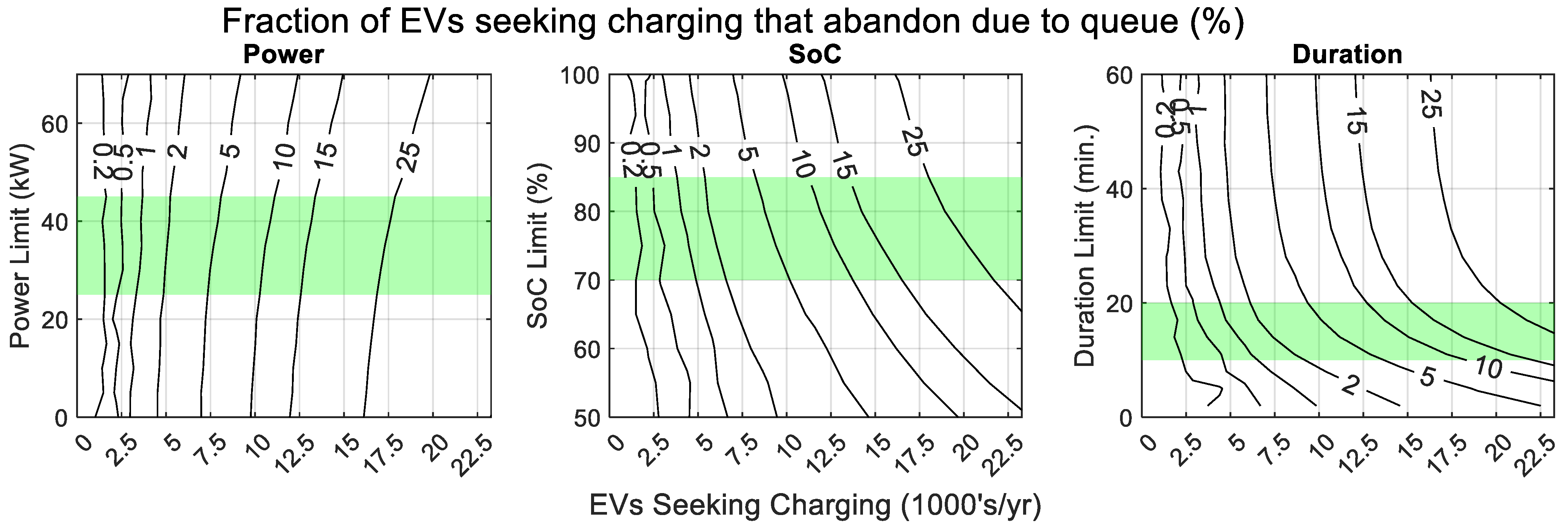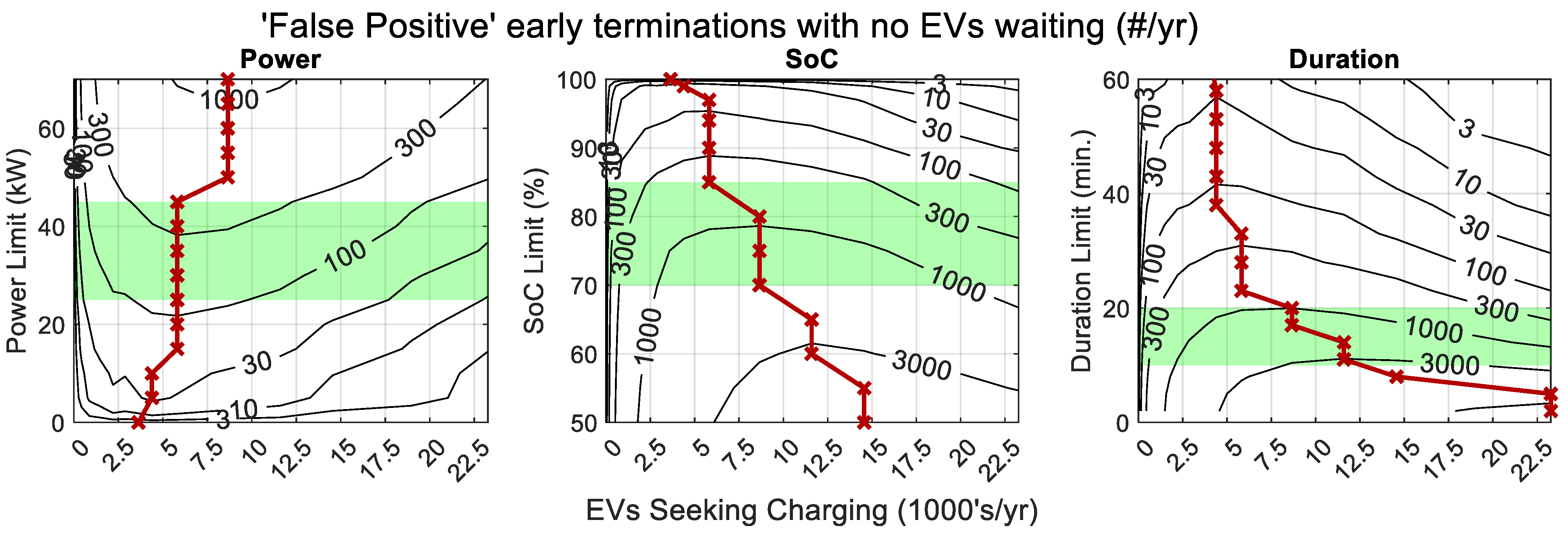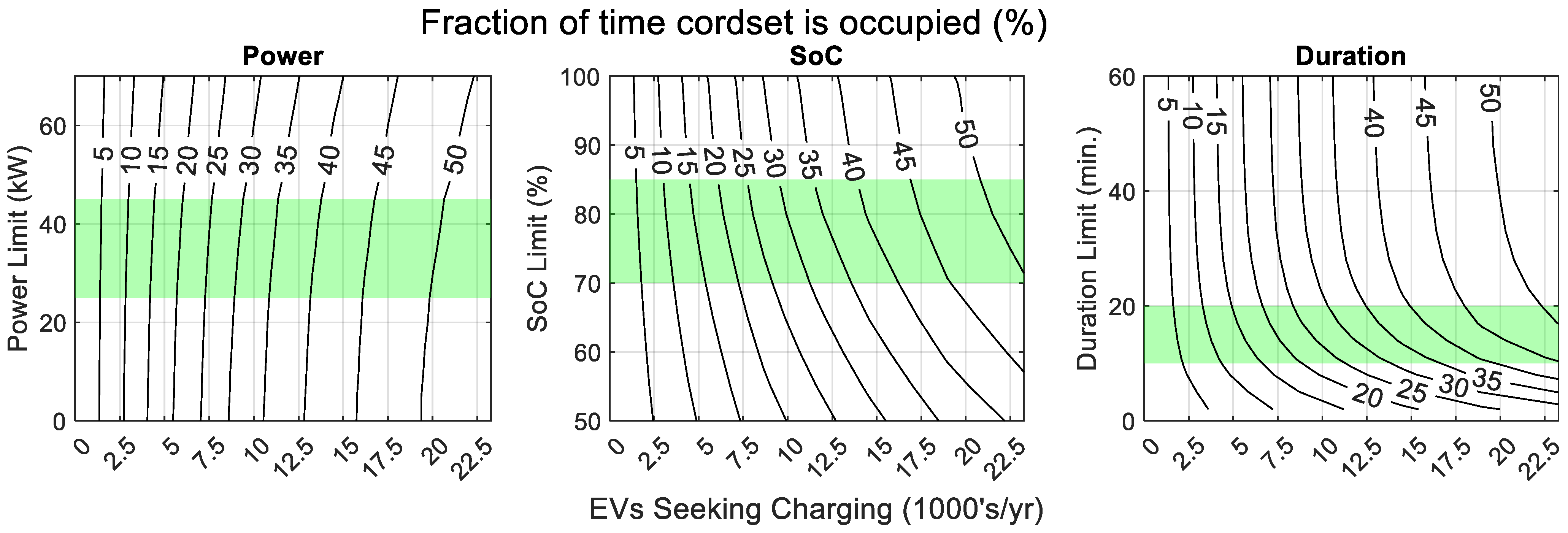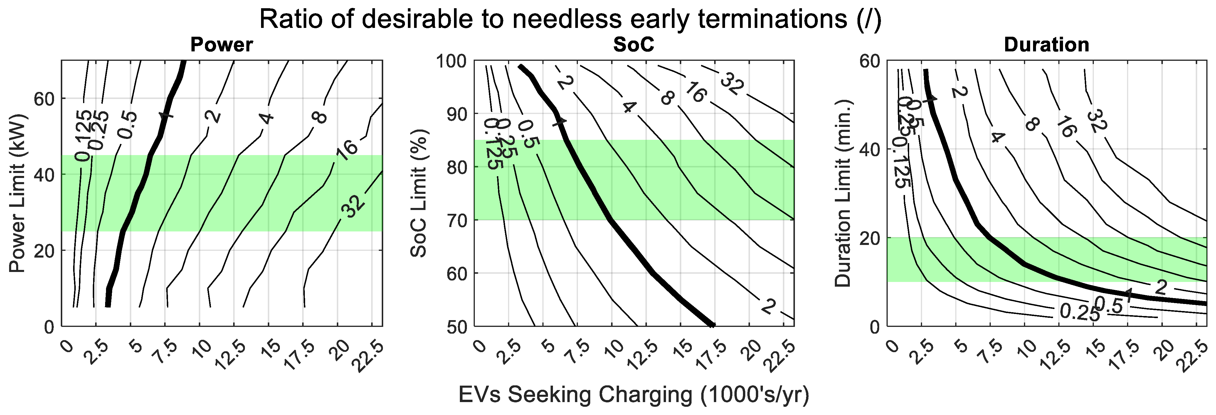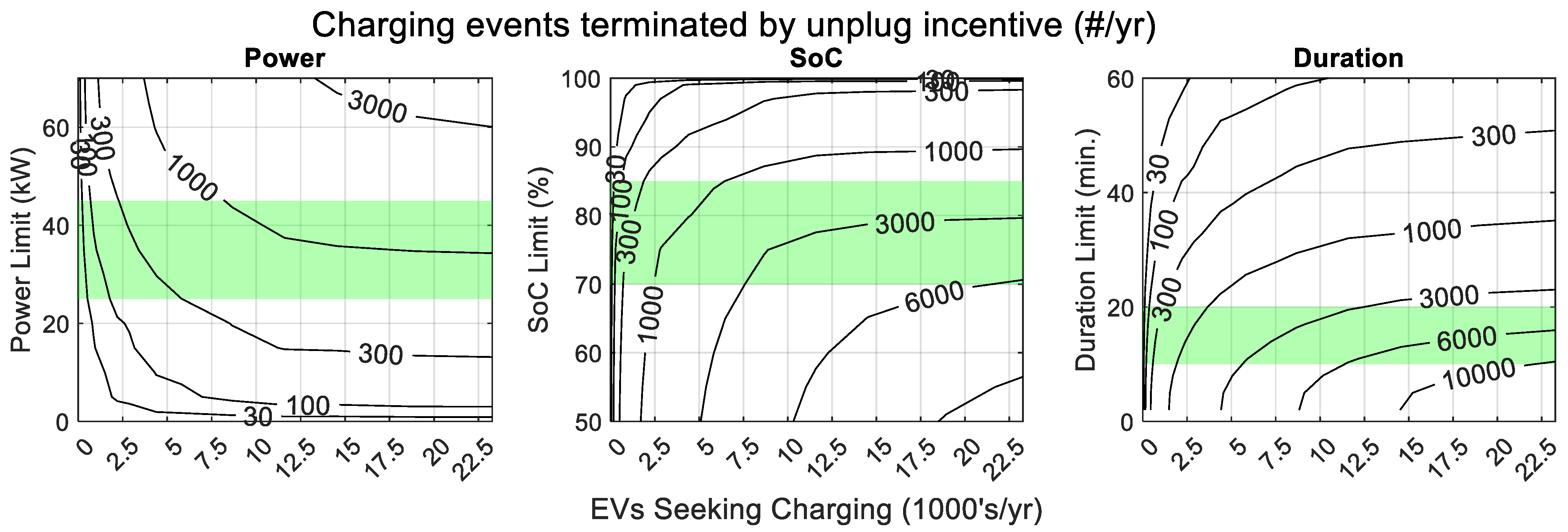 - Charging Power (left plots), under which a user would disconnect once the charging rate falls below a specified power (kW). Increasing the power limit (moving up in the plot) reflects a more restrictive tariff, while the null hypothesis is reflected at y = 0 kW.