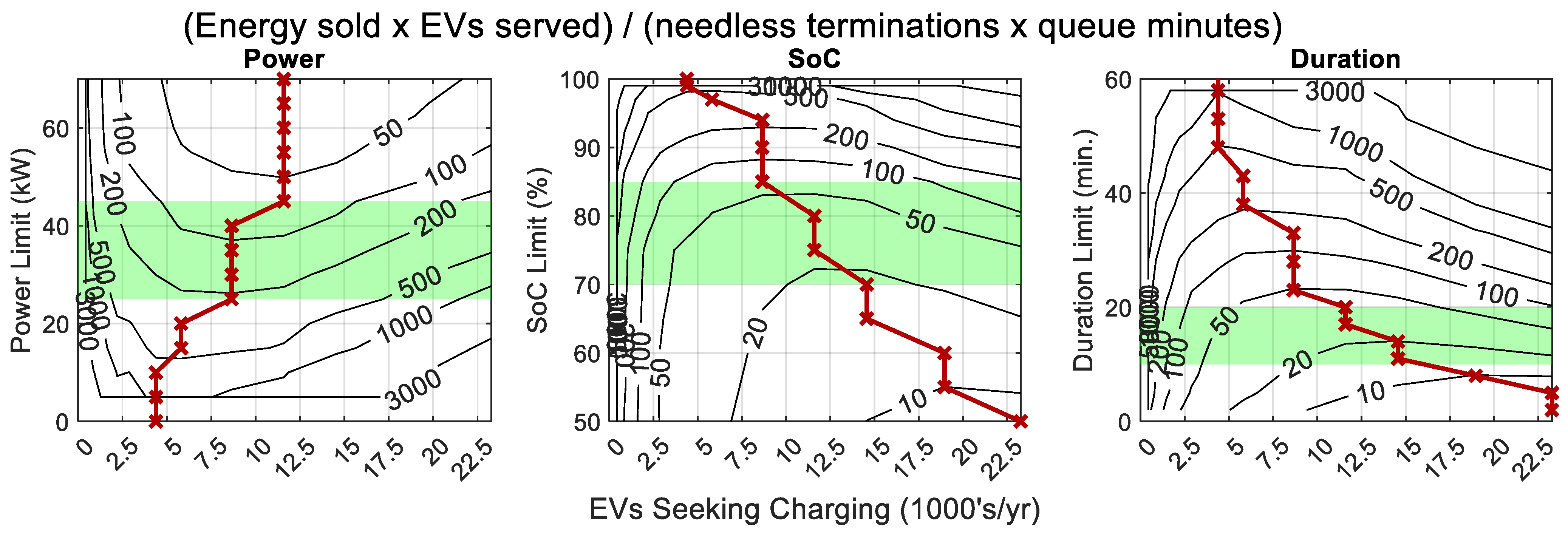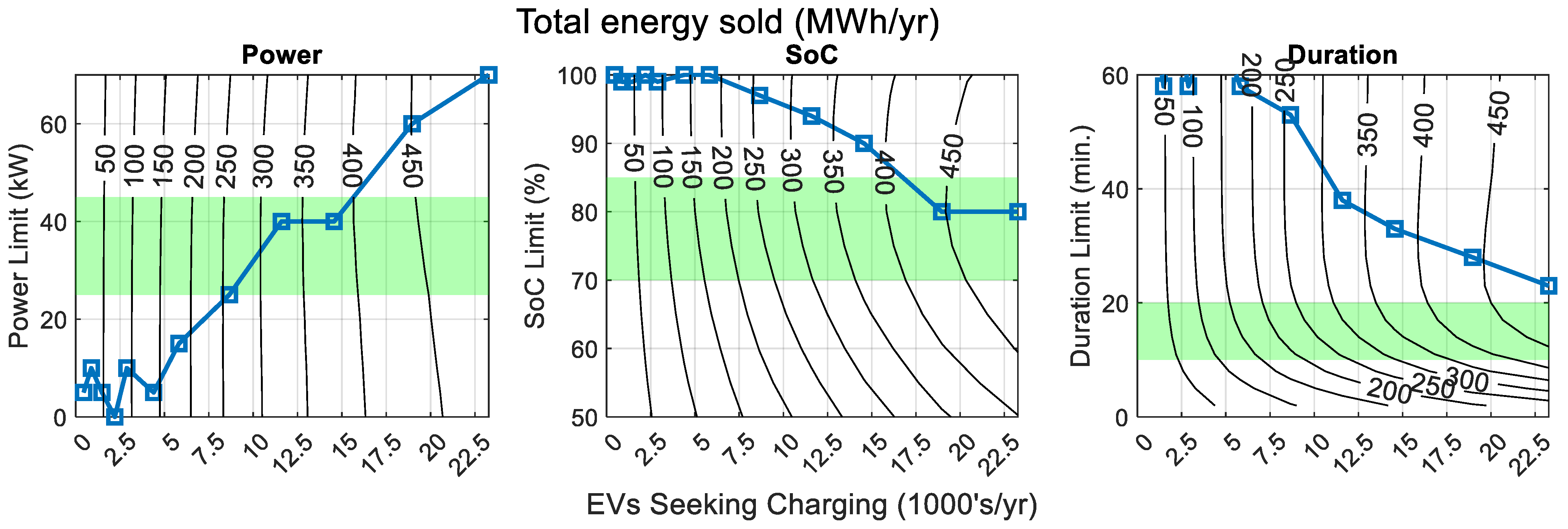 - Battery SoC (middle plots), under which a user would disconnect once their vehicle reaches a specified SoC (%). A lower maximum SoC threshold value (moving down in the plot) produces a more restrictive tariff, while the null hypothesis is reflected at y = 100% SoC.