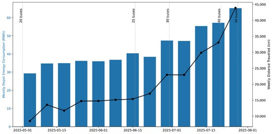 Weekly bus depot energy consumption (bars, MWh) and fleet distance travelled (line, km). Vertical dotted lines indicate fleet size changes, highlighting the strong coupling between operational scale and depot electricity demand.