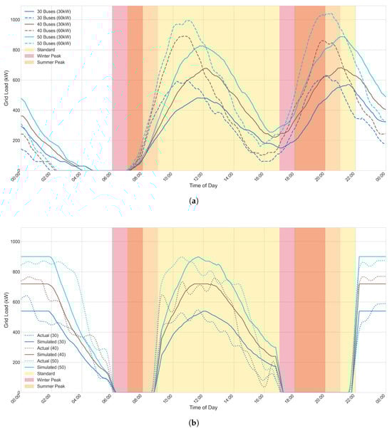 Comparison of grid load for unmanaged and off-peak charging strategies across charger ratings and fleet sizes: (a) simulated unmanaged charging at 30 kW and 60 kW for fleets of 30, 40 and 50 buses; (b) managed off-peak charging at 30 kW: simulated profiles and measured depot data for different fleet sizes.