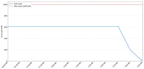 The simulation enforces the depot’s Notified Maximum Demand (NMD) [], which places a cap on allowable peak demand and therefore on associated demand charges. This directly shapes the distribution of charging across the fleet. In the GABS case study, the depot’s Notified Maximum Demand (NMD) is set to 1000 kW in line with the applicable tariff. The schedule enforces a hard cap so that the total depot demand charge never exceeds this value in any time slot.