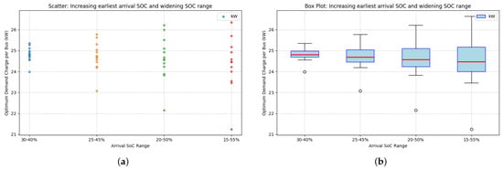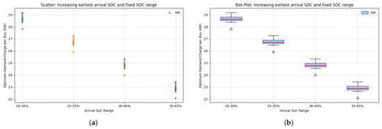 In the second case, the SOC band width was fixed at 10 percentage points and shifted upward: 20–30%, 25–35%, 30–40%, and 35–45%. The optimum demand declined approximately linearly as the minimum SOC increased (Figure 6a,b). At 20–30%, the optimum was about 28.5 kW, and at 35–45% it fell to roughly 22.5 kW. Each 5 percentage point increase in minimum SOC produced about a 1.5 kW reduction in the median optimum demand. Interquartile ranges were narrow across cases, indicating predictable capacity needs when the SOC band is fixed and higher.