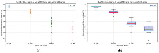 In the third case, the minimum SOC was fixed at 20% and the upper bound increased from 25% to 45%. Contrary to a naive expectation of higher peaks, the average optimum demand decreased as the upper bound rose (Figure 7a,b). With arrivals at 20–25% SOC, the optimum was around 29 kW. Extending to 20–45% allowed some buses to arrive with small energy deficits, reducing the median optimum to about 24 kW. Variability increased, reflecting the diversity in arrival SOC. This suggests that diversity can be exploited to smooth peaks, since higher-SOC arrivals effectively free capacity for lower-SOC arrivals, although occasional low-SOC arrivals can still create short peaks.