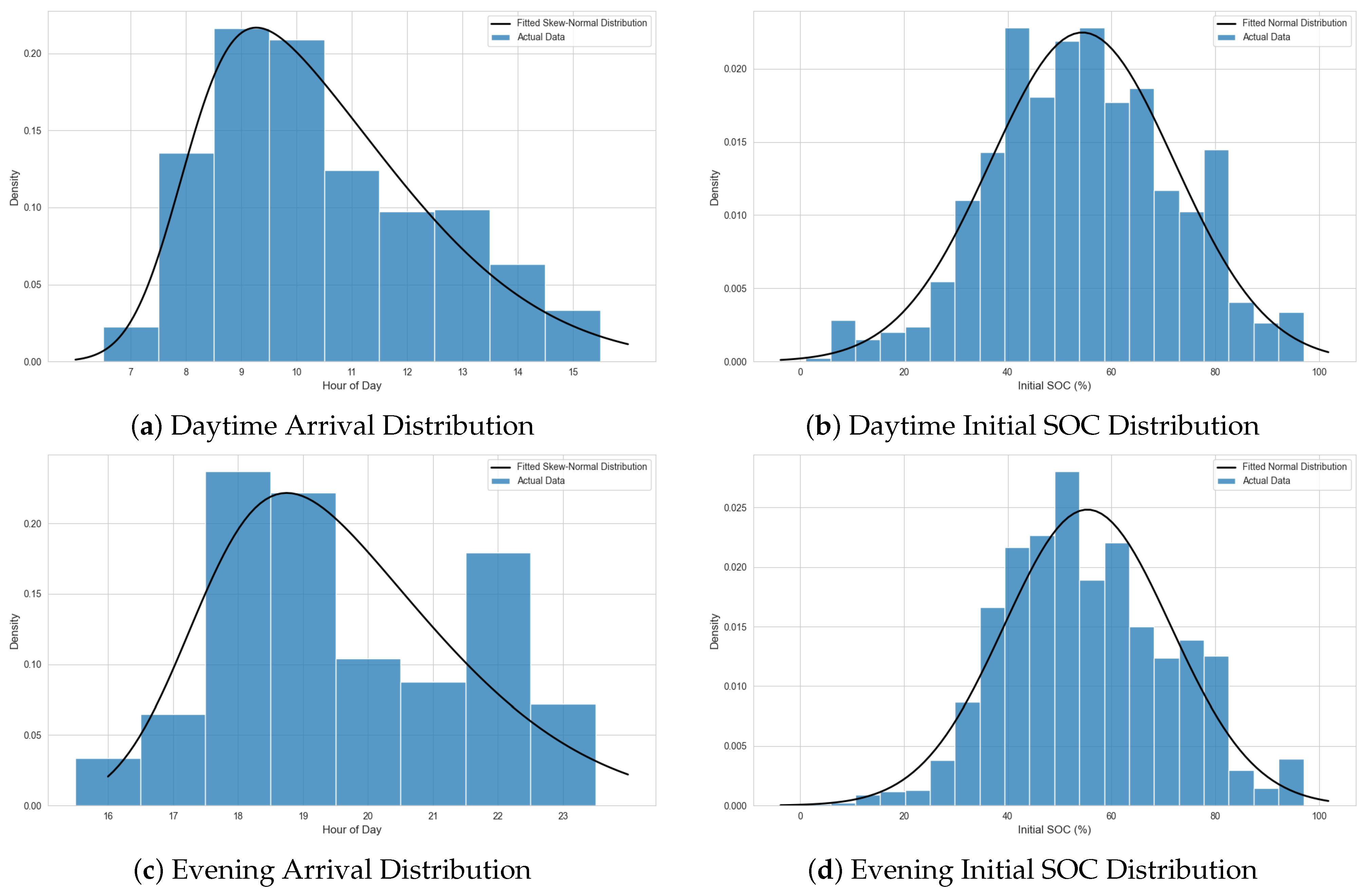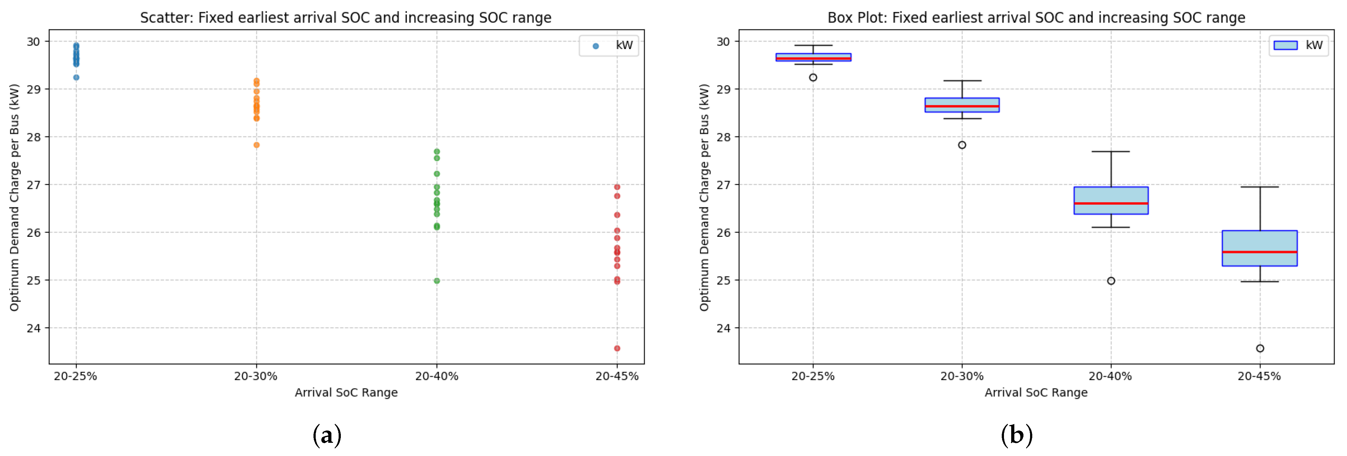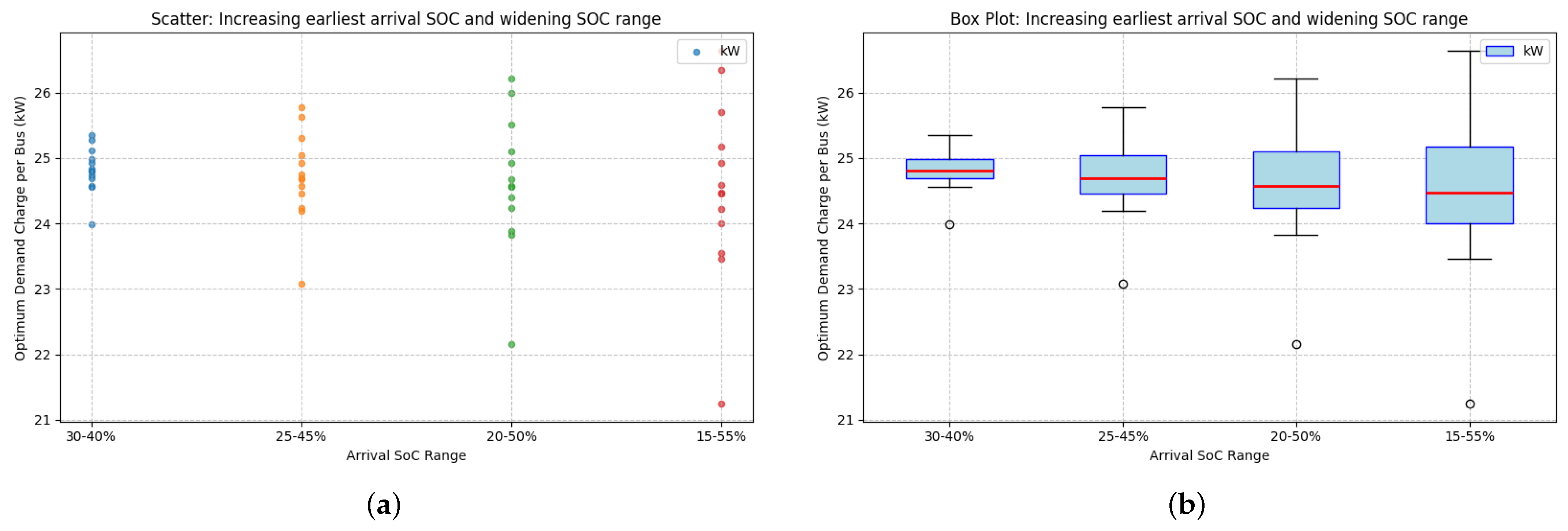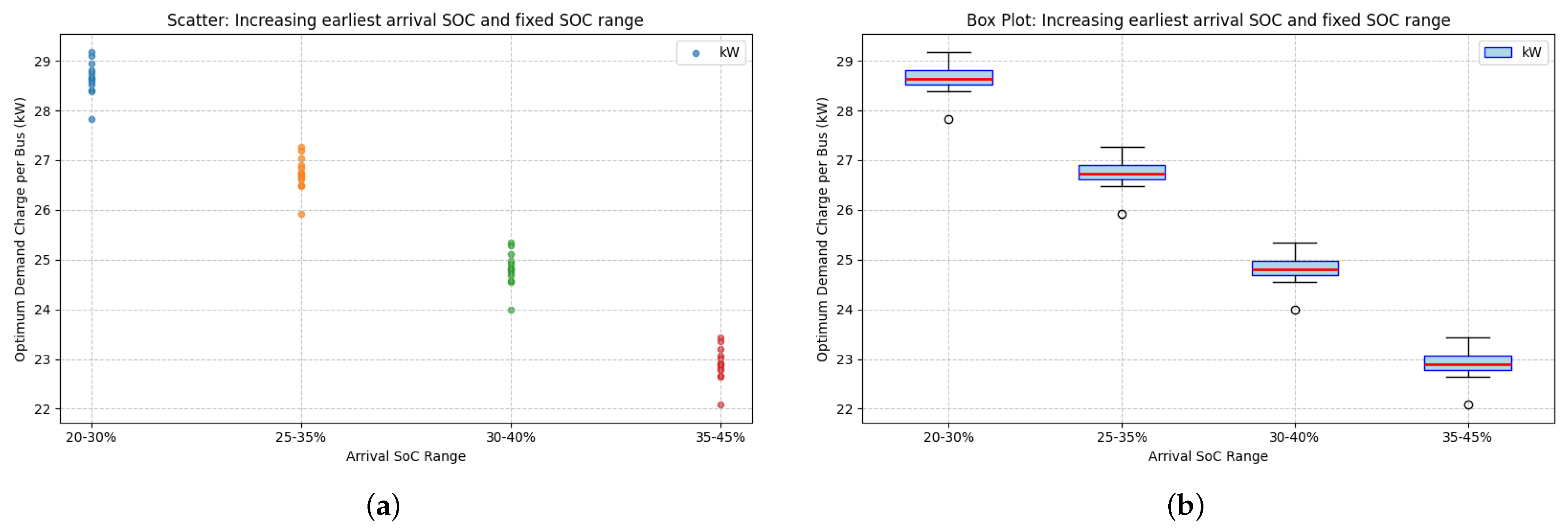 Using the derived inputs, the simulation reproduced charging demand as buses arrived with specific SOCs and were connected to chargers, whilst capping the maximum simultaneous charging events in the system. The resulting grid load was driven primarily by the distributions of arrival times and SOC, as well as the charger power profile. Arrival times were split into daytime (08:00–16:00) and evening (16:00–24:00) categories.