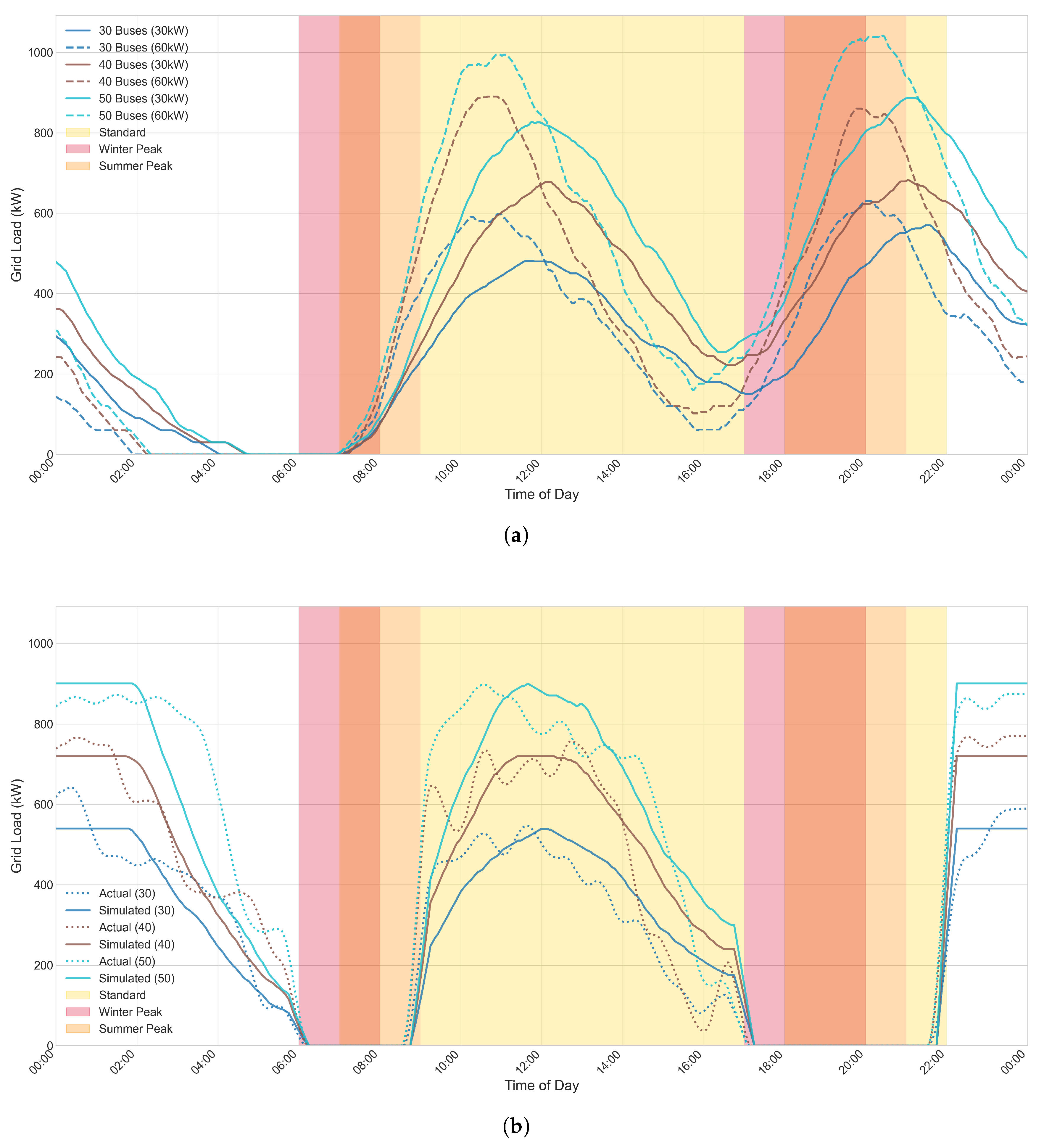 The simulation framework accounts for key determinants of charging demand, including the distributions of bus arrival times at depots and the states of charge of their batteries upon arrival. Using these inputs, the study evaluates the comparative impacts of unmanaged versus managed charging under different charging rates and within the constraints of a time-of-use tariff structure.