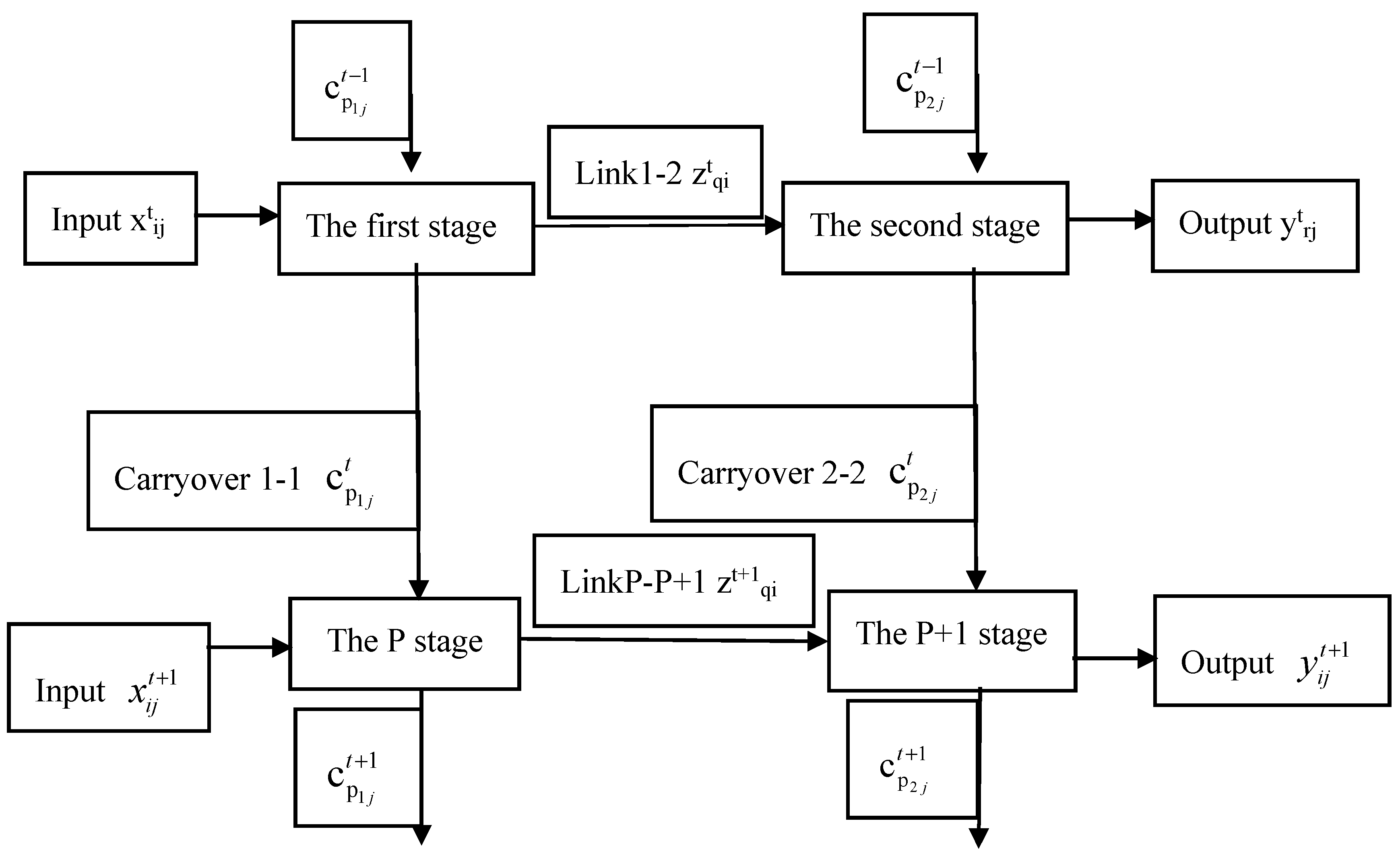 Tone and Tsutsui (2014) [19] developed a dynamic network DEA model by integrating the slack-based network DEA model with the slack-based dynamic DEA model, establishing a DEA framework that accounts for both network structure and inter-period dependencies [20,21]. In the horizontal dimension, dynamic network DEA connects two departments through the network structure in each period; in the vertical dimension, it combines the network structure through carry-over methods. This model enables the assessment of comprehensive efficiency, period-specific dynamic change efficiency, and department-specific dynamic change efficiency over the entire observation period.