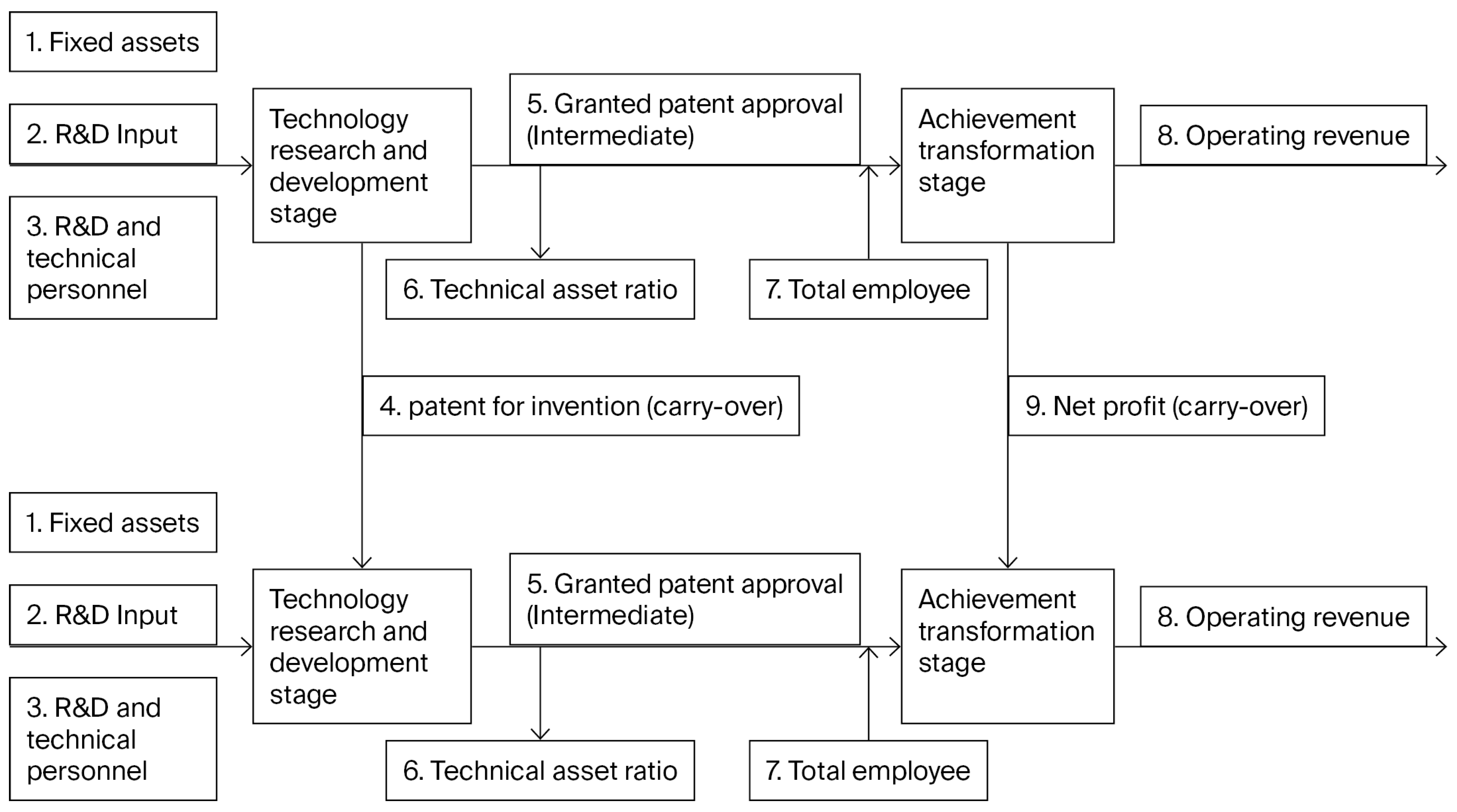 The two-stage dynamic network DEA model was used to evaluate the technological innovation and technical efficiencies of listed new energy vehicle companies in two stages: the technology research and development stage and the achievement transformation stage. There were nine input and output indicators, including fixed assets, R&D investment, number of enterprise R&D personnel, number of patent authorizations, technology asset ratio, number of valid invention patents, total number of employees, and business income of the enterprise [25,26].
