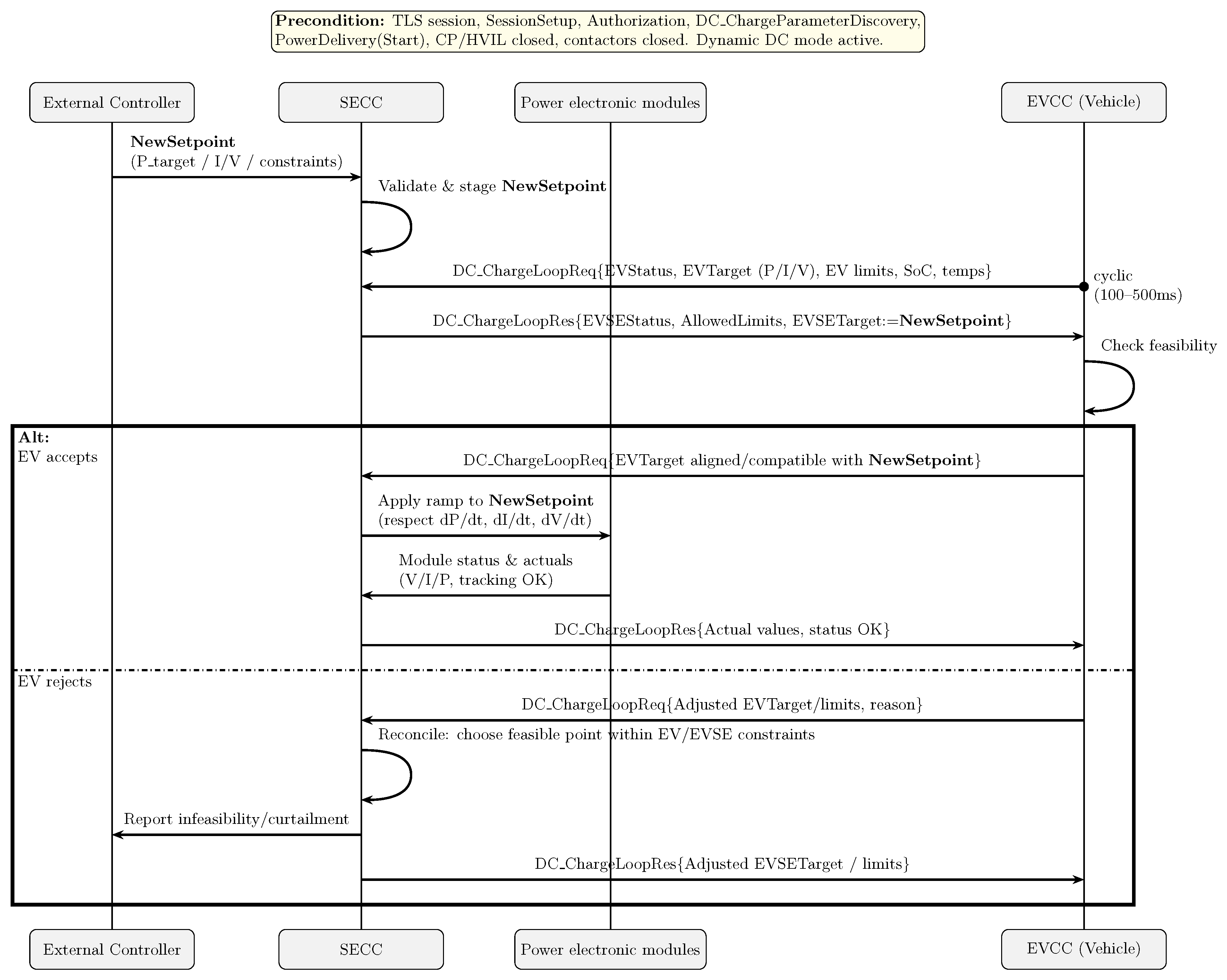 When an external controller issues a new setpoint, the SECC first validates and stages it based on grid constraints, connector ratings, and ramping policies. This setpoint is not directly applied to the power modules. Instead, the SECC awaits the next cyclic request from the EVCC. Upon receiving it, the SECC embeds the new target in its response. The EVCC then checks feasibility—consulting battery management and thermal systems—and either accepts or rejects the target. If accepted, the SECC applies ramping constraints (e.g., respecting ramping rates) before forwarding the setpoint to the power modules. The modules report actuals and tracking status, and further adjustments may be negotiated through continued message exchange.