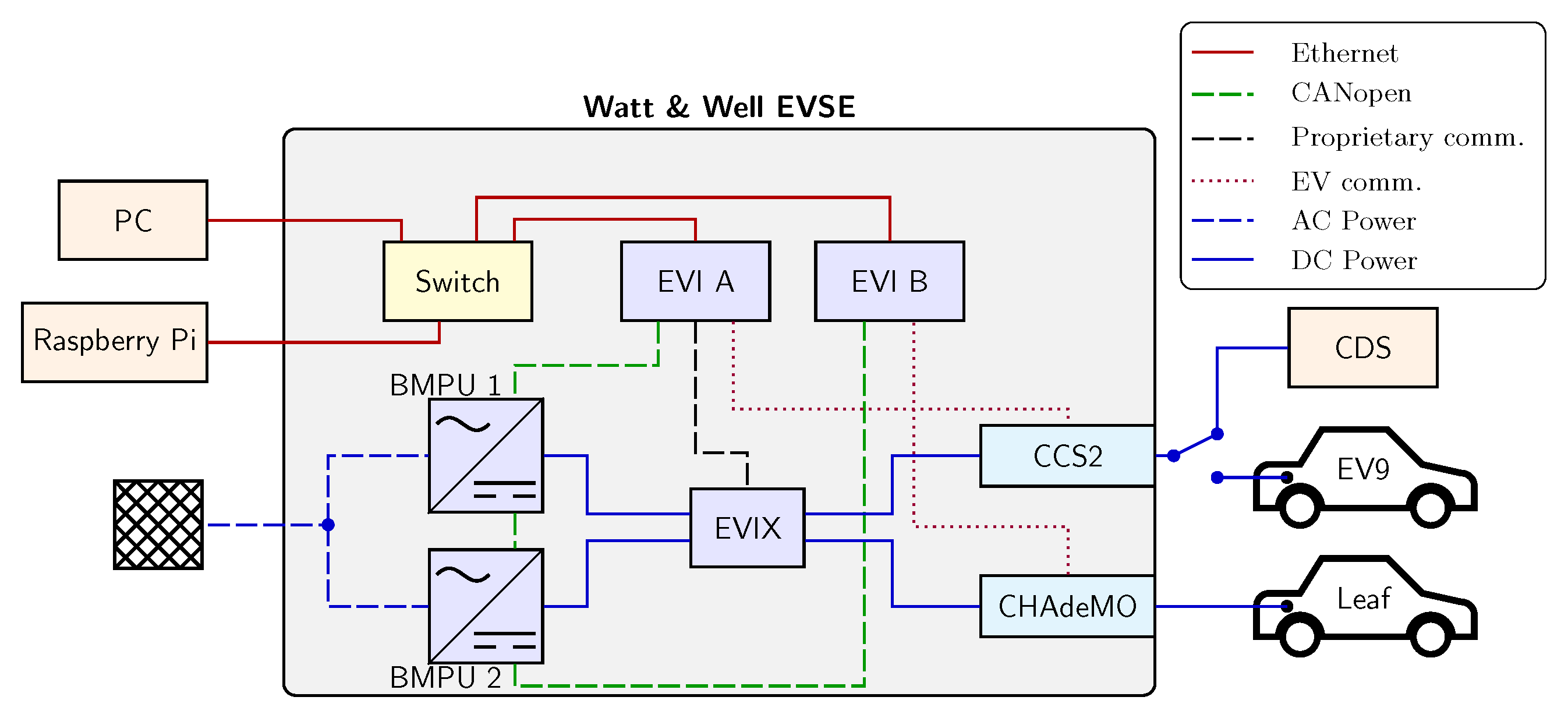 The experimental setup consists of three main subsystems: the EVSE, the control system, and the EV. The tests performed revolve around the Watt & Well bidirectional DC EVSE in multiple configurations connected to both the CDS and different EVs, as shown in