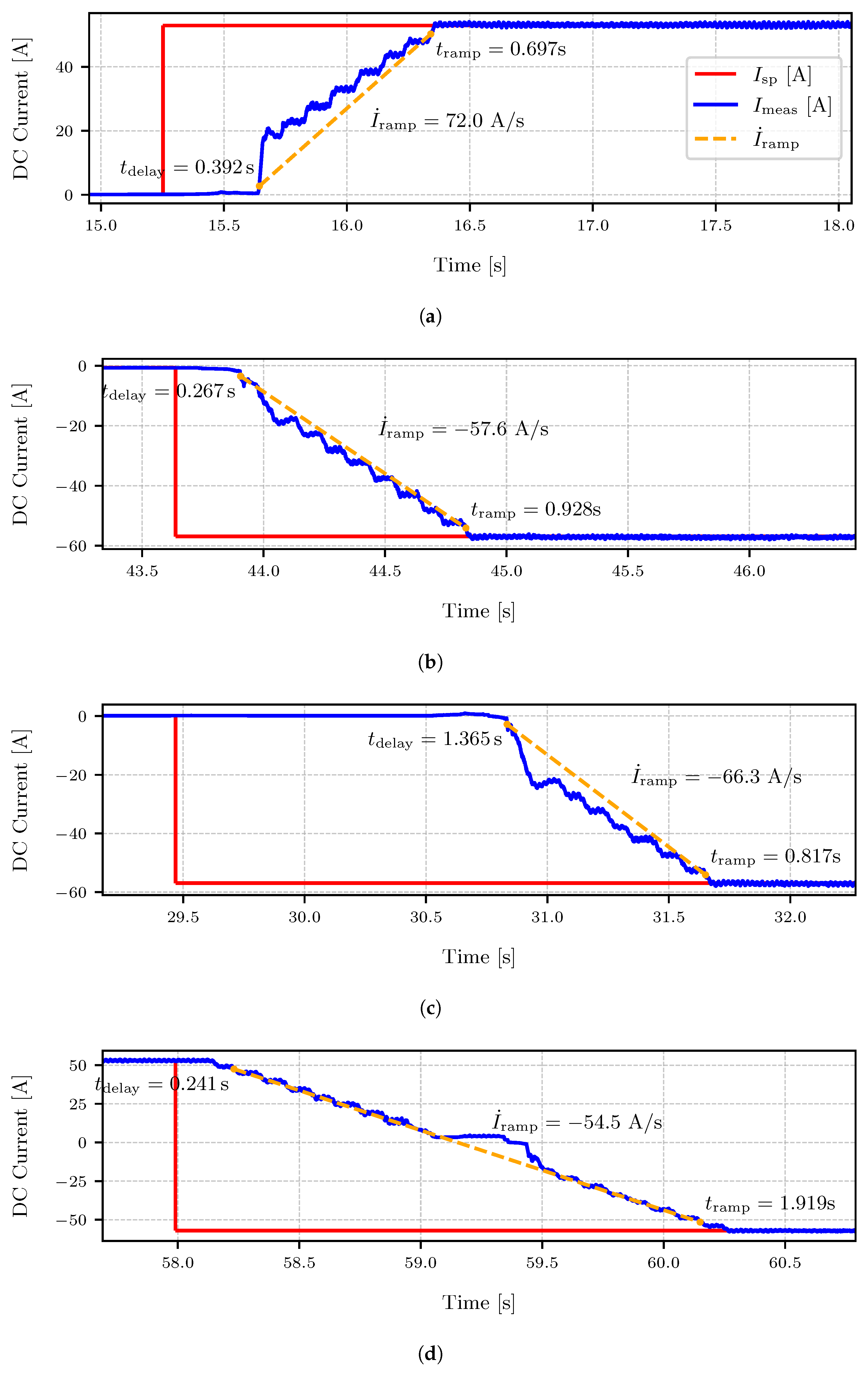 32], the sequence is structured to assess performance across various critical scenarios, including simple step changes in the current setpoint, and power flow reversal (PFR) events. A priming period for the run ensures that the previous power flow direction of each step is known. Preliminary tests showed that a 5-s interval between setpoint changes was sufficient to stabilize the current.