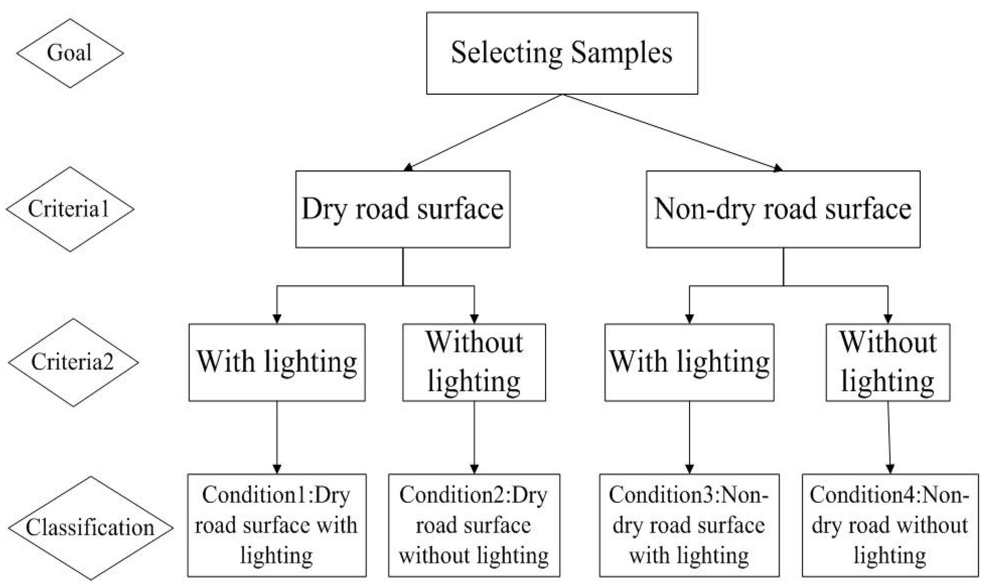 20] employed factor analysis and structural equation modeling to investigate inattentive driving at HRGCs. They identified gender, age, income, driving frequency, residence years, and safety information exposure as significant determinants, and revealed interactions between these factors and drivers’ patience and safety attitudes, showing that females, younger, and high-income drivers with lower patience and weaker safety attitudes were more prone to inattentive driving. The above several studies indicate that significant interactions exist among different influencing factors; however, current research remains insufficient. In particular, the interaction between road surface conditions and lighting has not been examined. Previous studies have shown that both factors exert significant effects individually, yet under interaction their mechanisms may change substantially, which could affect policy implementation.