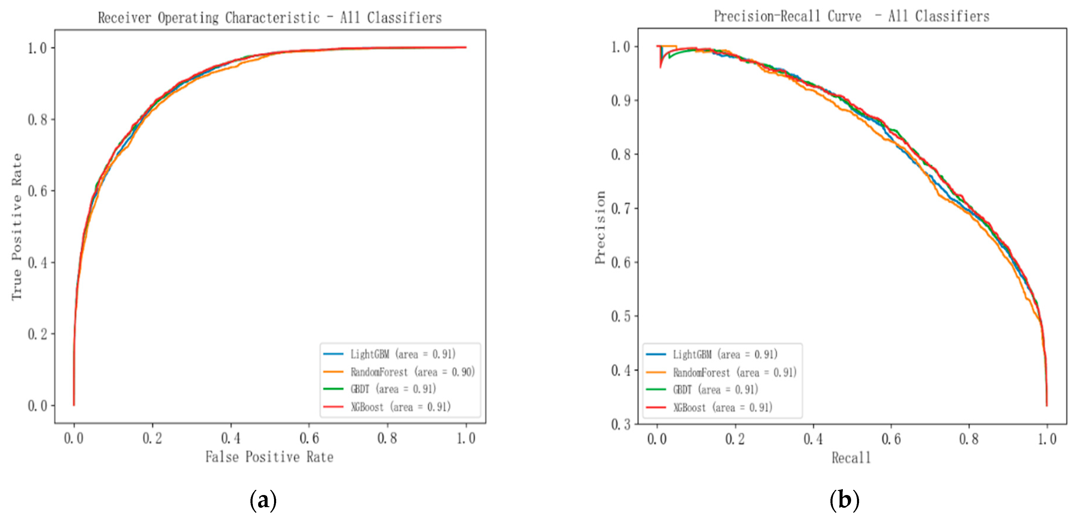 Figure 5 presents the ROC (a) and PR (b) curves of all classifiers. All four models exhibited high and comparable predictive performance, with AUC and PR-AUC values around 0.90–0.91. Among them, XGBoost and LightGBM slightly outperformed the others, showing smoother and more stable curves across different thresholds, while Random Forest achieved marginally lower scores (AUC = 0.90). These results demonstrate that XGBoost provides superior stability and generalization compared with traditional ensemble methods.