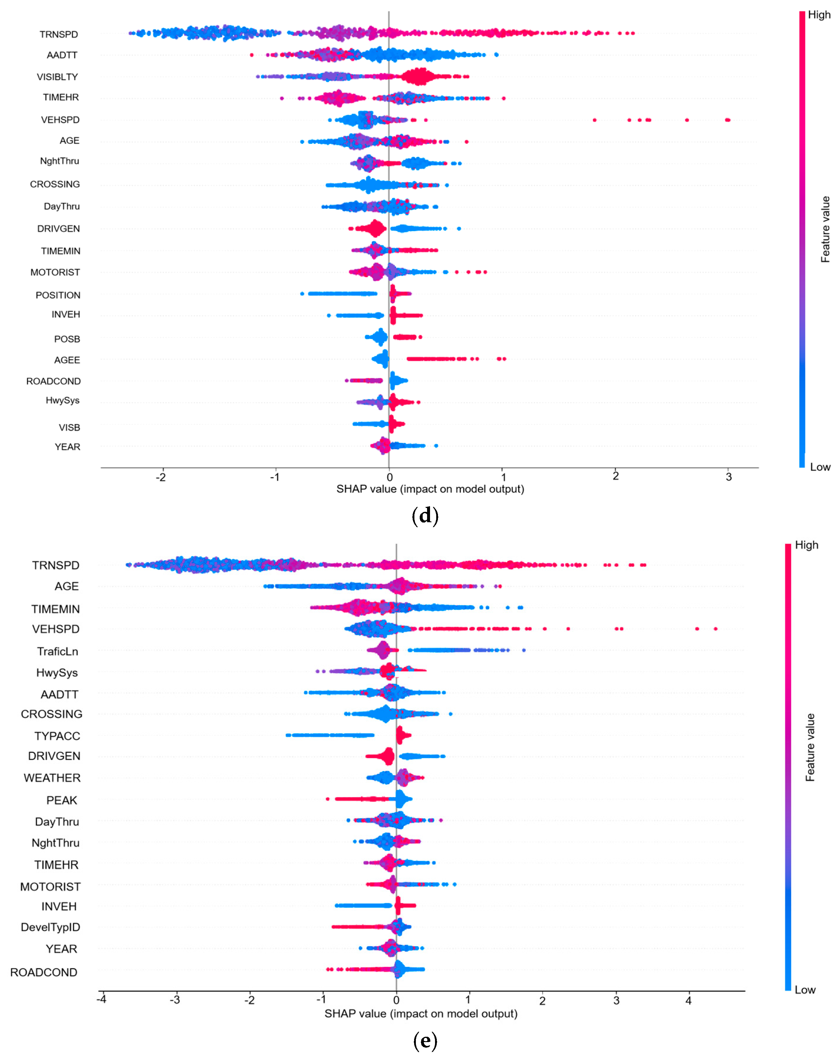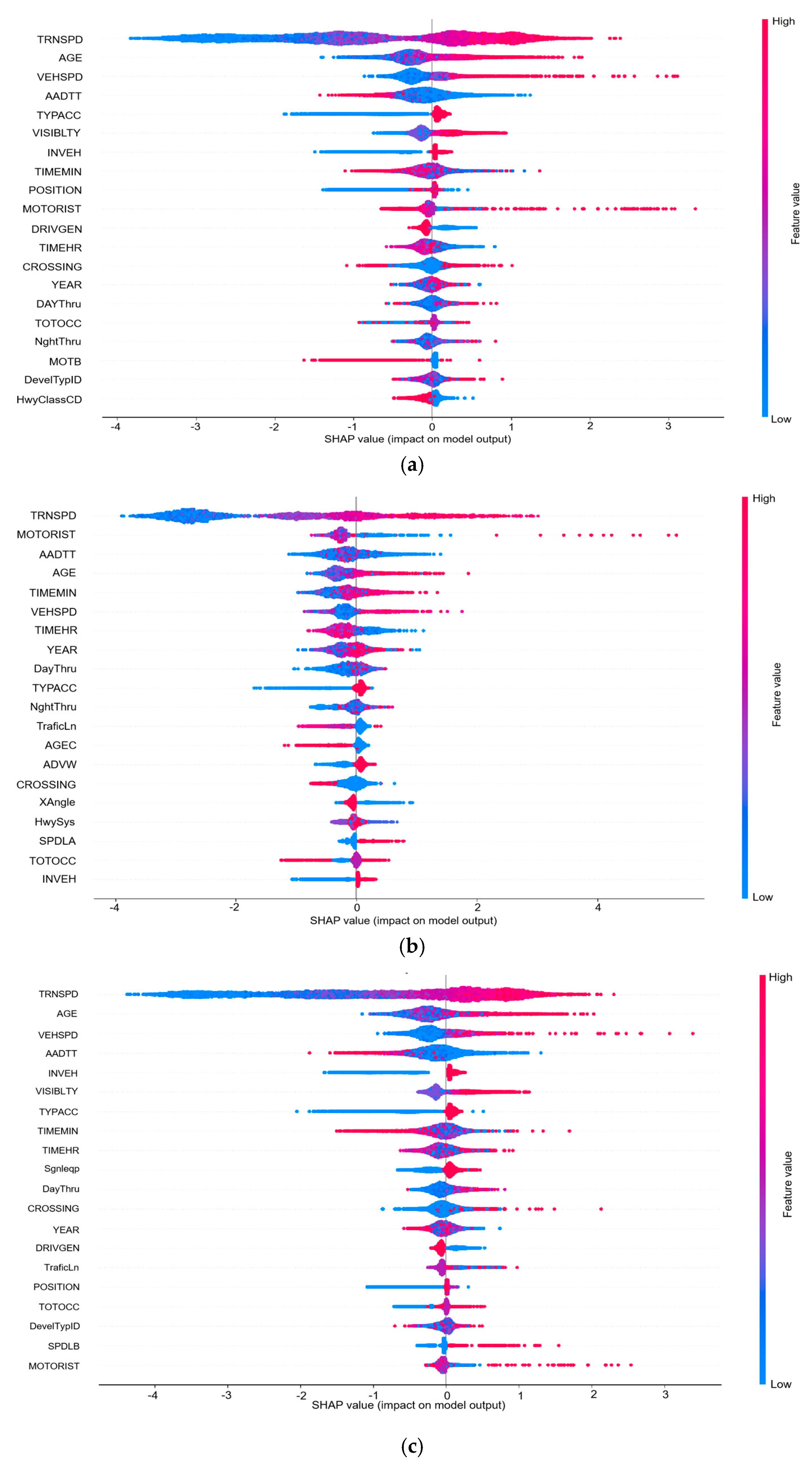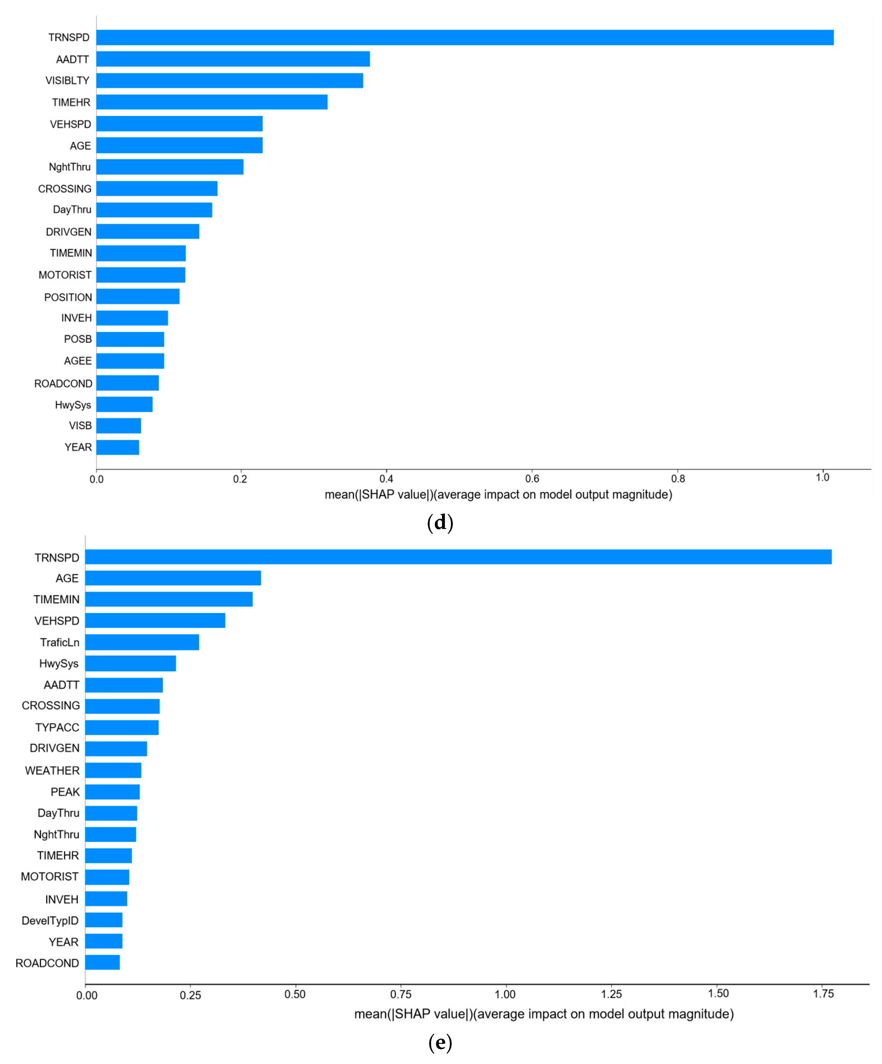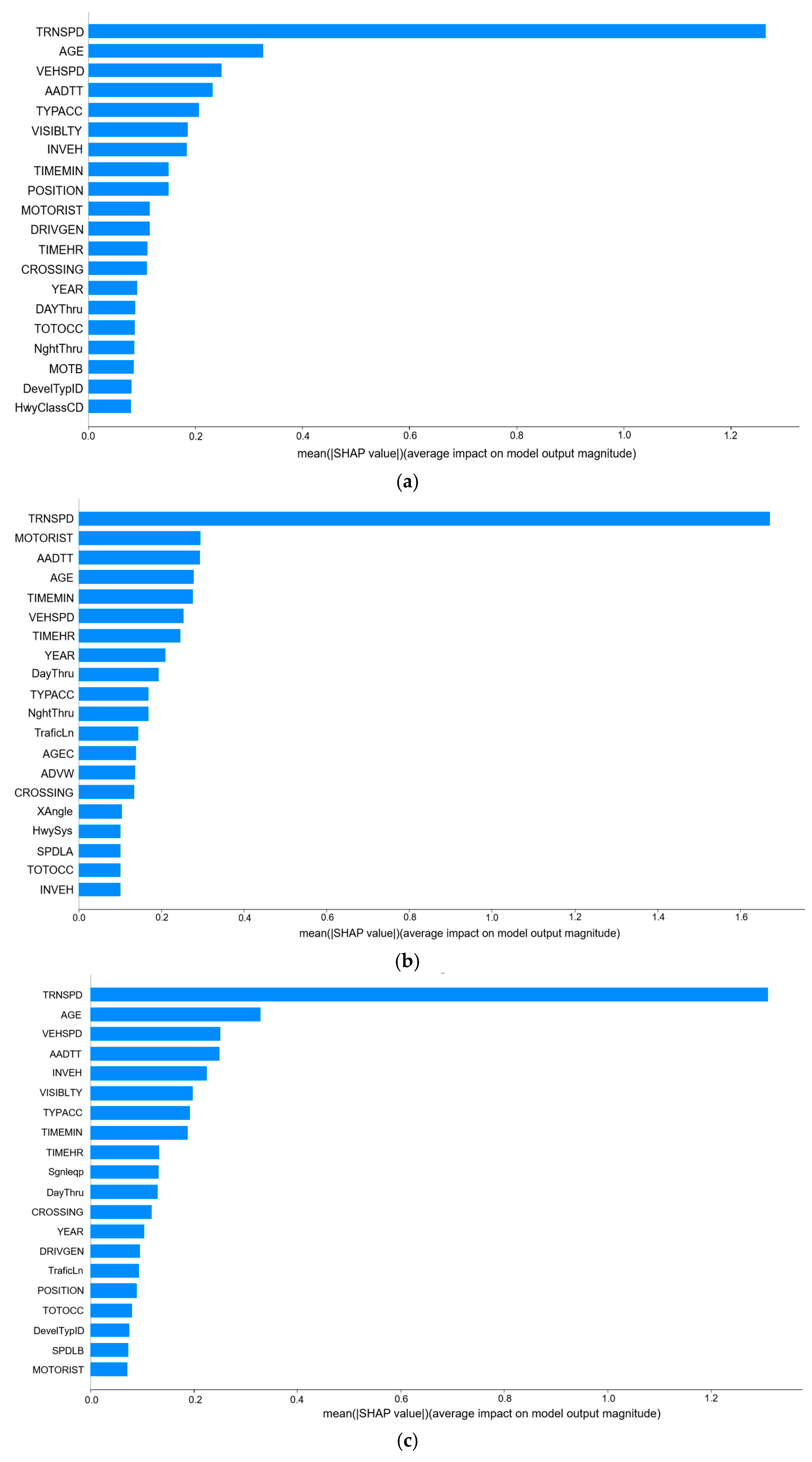 Figure 6 illustrates the global feature importance derived from the XGBoost model. The results demonstrate that the five most influential features are: “TRNSPD”(train speed), ”AGE” (driver age), “VEHSPD” (vehicle speed), “AADTT”(average annual daily traffic), and “TYPACC” (type of accident).