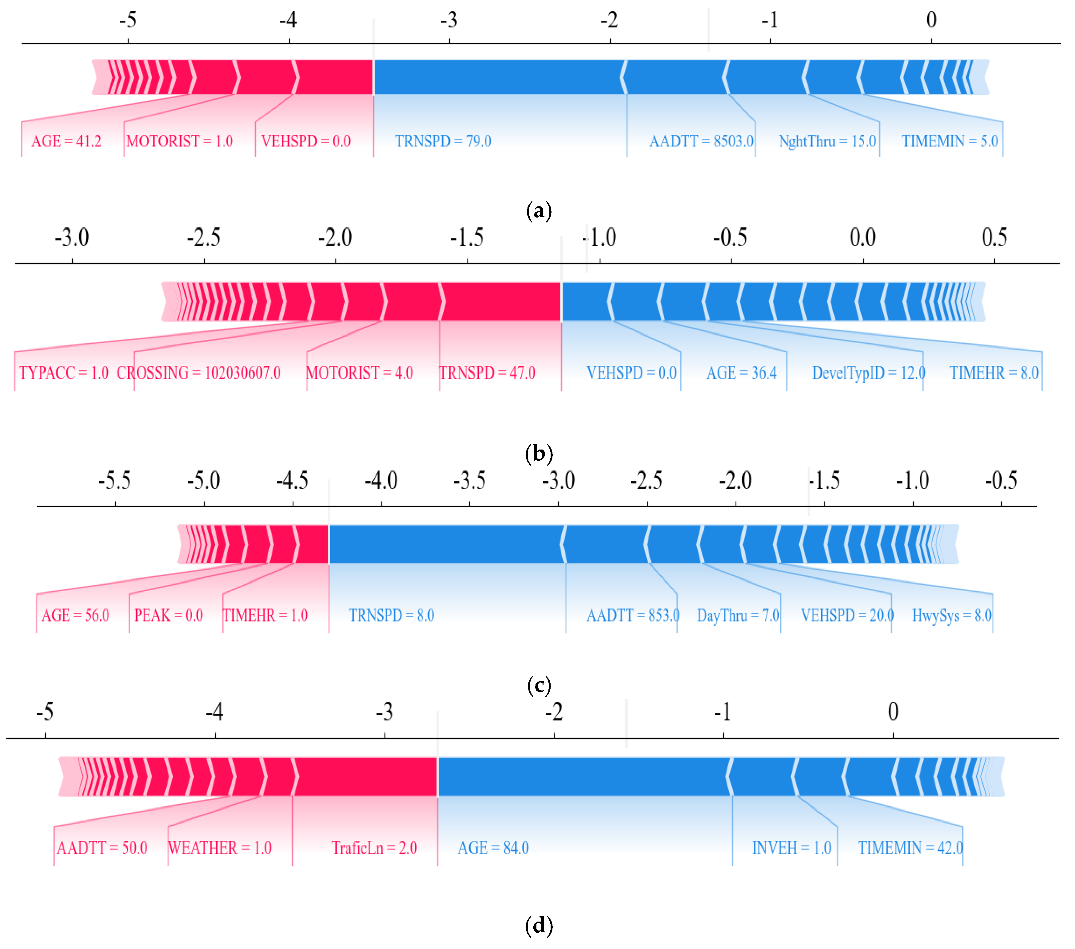 To study the contribution of various factors to the severity of driver injuries in accidents at highway–railroad grade crossings, SHAP force plots were generated for the accident dataset in each scenario, as shown in