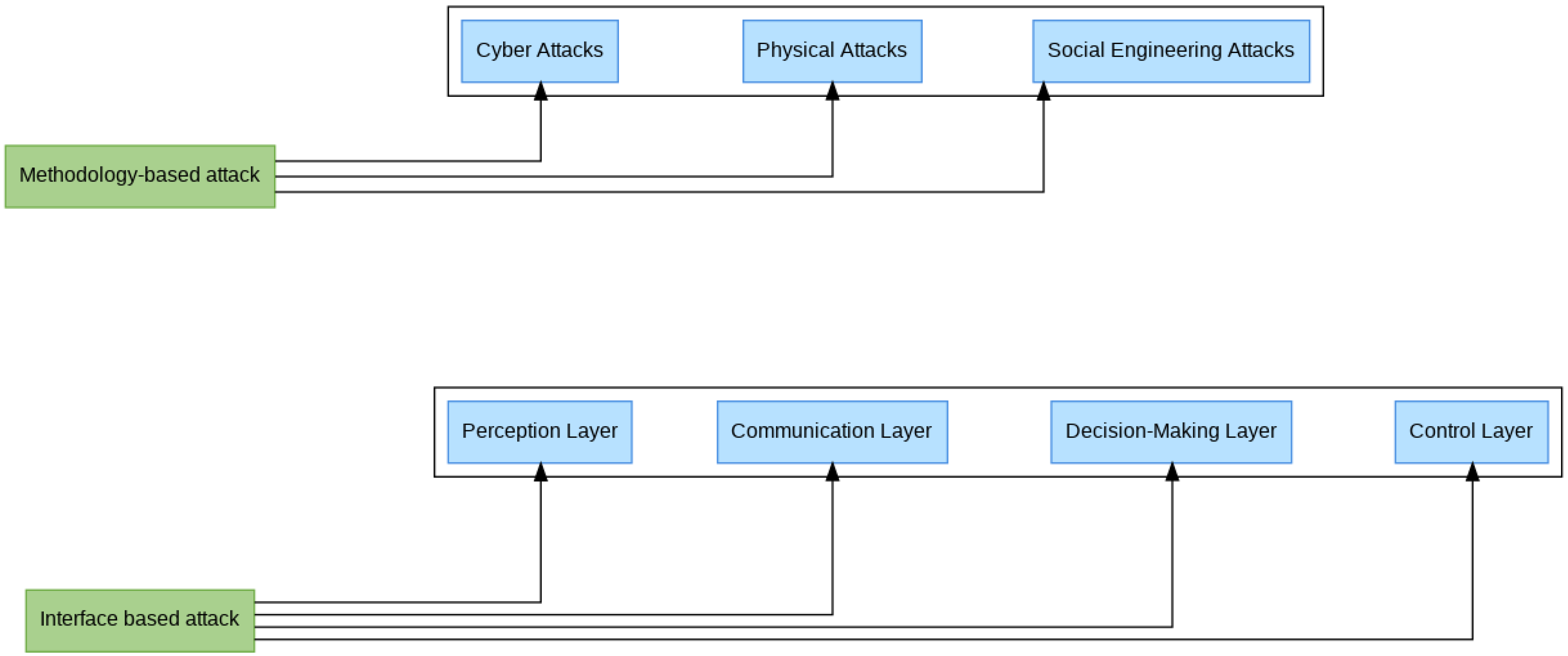 - Physical attacks: The direct impact is on vehicle hardware parts, especially sensors and communication systems. For instance, the manipulation of sensors includes acts such as covering, blocking, or degrading, all of which impede correct perceptions by the vehicle of its environment [35]. This may lead to errors of judgment or failure of autonomous driving systems that could compromise vehicle safety.