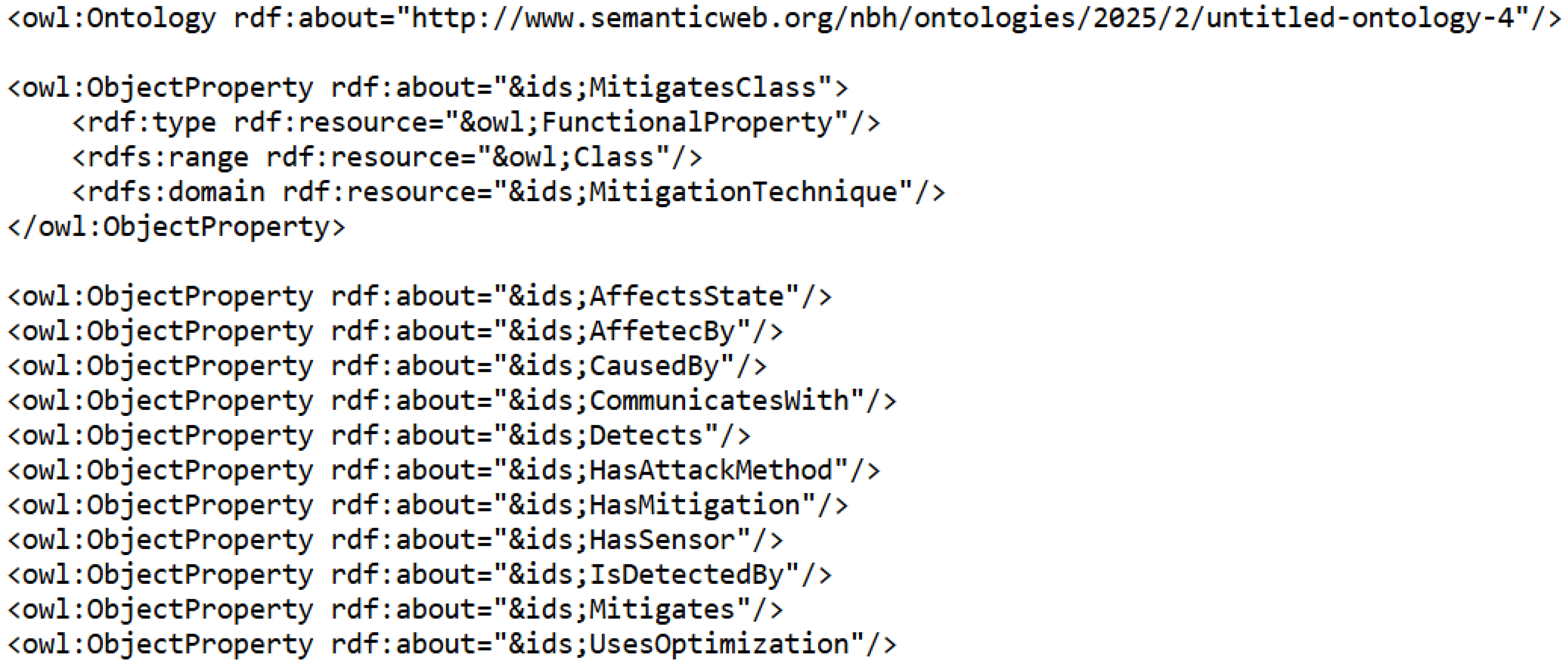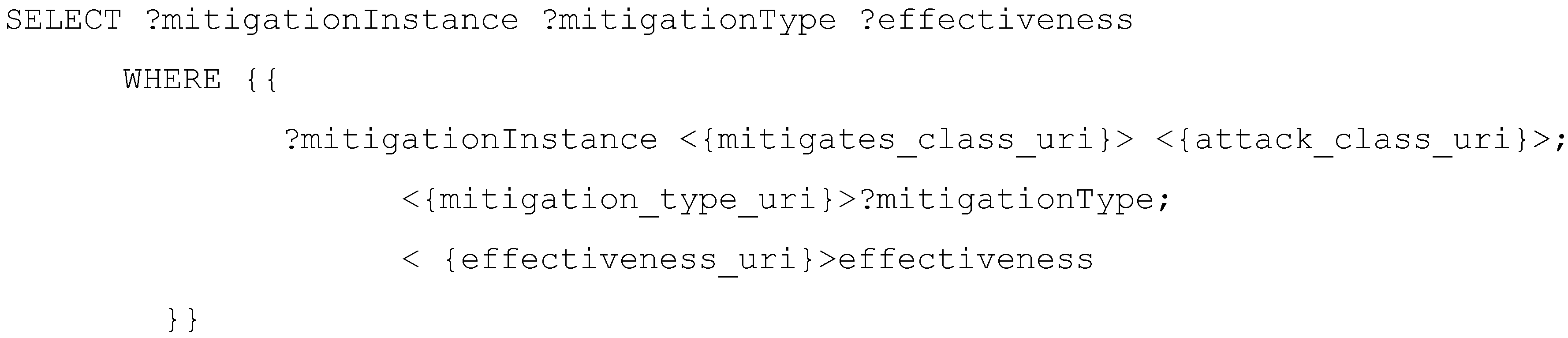 - Lack of Mitigation-Centric Integration: Most existing ontologies focus exclusively on descriptive modeling of threats (e.g., [8,10]) or vehicular context (e.g., [11,14]). They lack the functional capability to seamlessly link a detected intrusion event to an appropriate, context-aware mitigation strategy using automated reasoning.