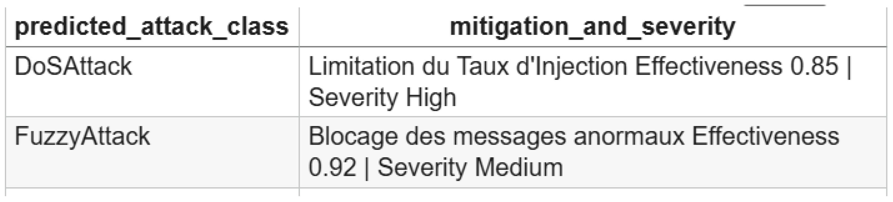 - Impersonation Attack (High Integrity Risk): The injection of a forged, known ID was classified as a specific ‘Trust Attack’. The reasoning engine selected the most effective countermeasure: ECU Isolation and/or Revocation of the Impersonated Node.