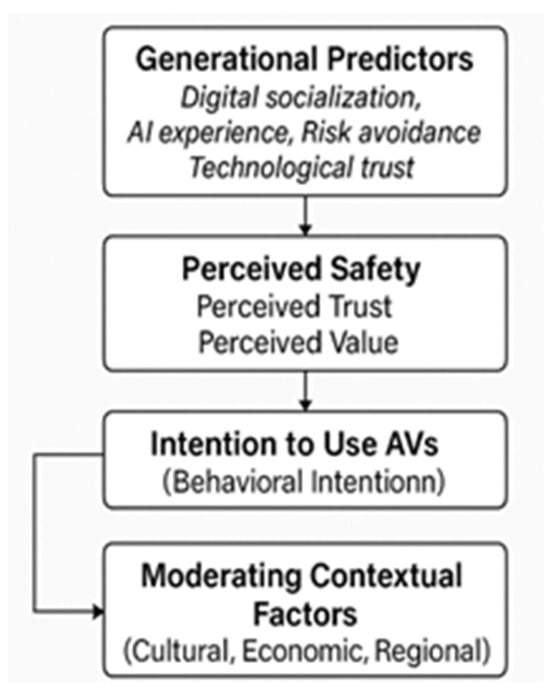 Based on a review of the literature, it has become clear that the acceptance of autonomous vehicles (AVs) cannot be explained solely by individual psychological factors (e.g., trust, perceived usefulness, safety). The social embeddedness of technology and the perception of technology by different generations are shaped by cultural, economic, and regional contexts. The proposed conceptual model depicts these factors as a hierarchical and interactive system, where contextual variables indirectly influence AV acceptance through generational attitudes.