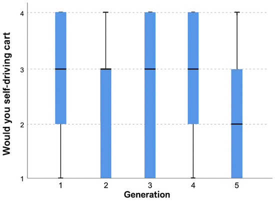 Generation Y, which grew up in the middle of the digital revolution, is much more open to self-driving cars. For them, technological innovations are not just tools, but part of a way of life, and they are taking a creative approach to self-driving technologies in terms of transport solutions [33]. Their acceptance of this type of vehicle may be strengthened, especially if it meets the generation’s expectations, such as comfort and environmental protection [34].