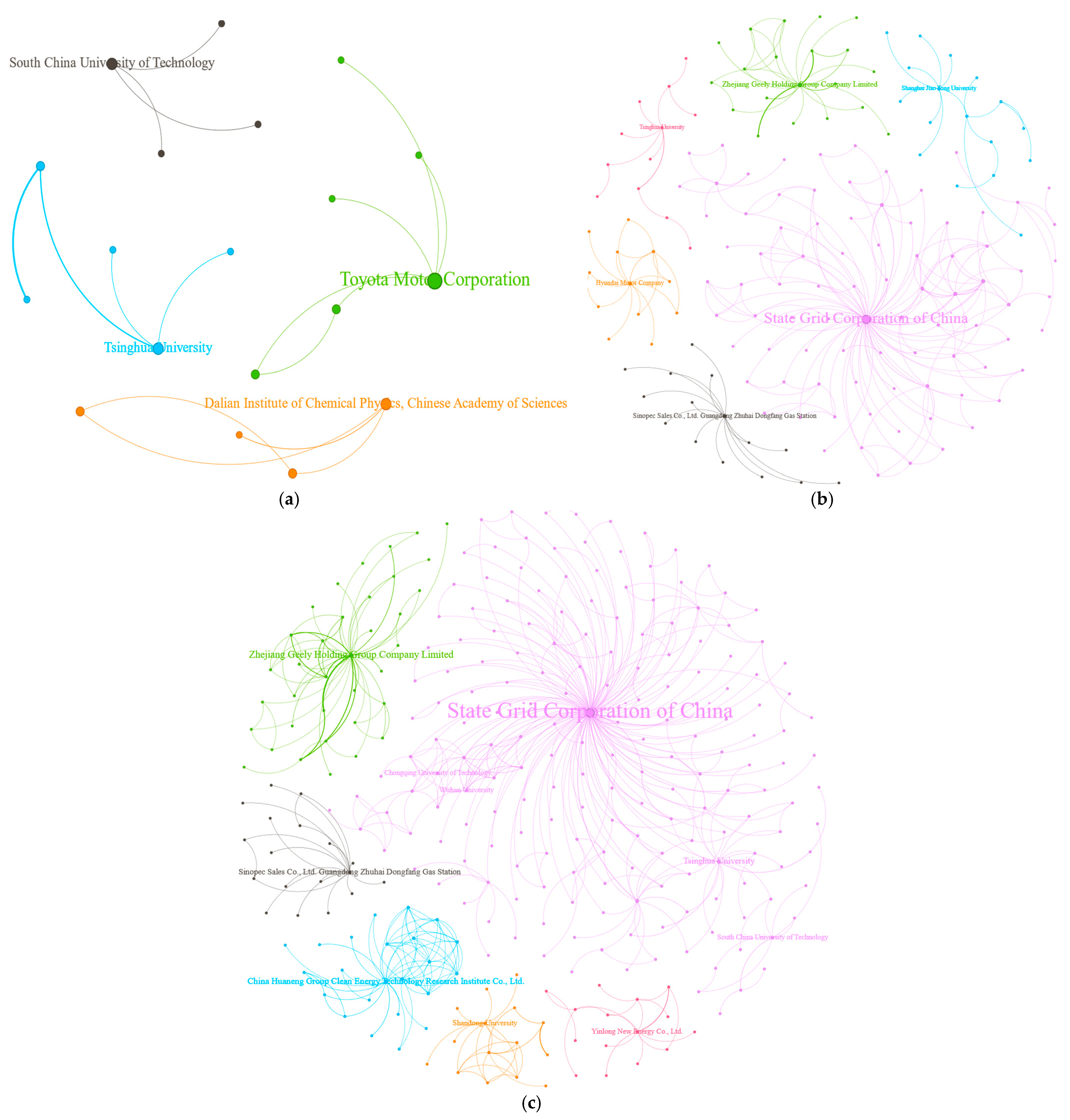 During its initial development (2001–2008), collaboration was sparse and led by universities and foreign firms (e.g., Toyota). This was followed by rapid growth (2009–2017): During this period, state-owned enterprises (e.g., SGCC) reshaped the network into a core–periphery structure through policy leverage and infrastructure dominance. Maturity was reached (2018–2022): In this period, the core continued to consolidate, absorbing key academic clusters, while private firms (e.g., CATL) emerged as major technology contributors. This resulted in a dual innovation model in which SOEs coordinate the ecosystem and private firms drive specialized technological advancement.