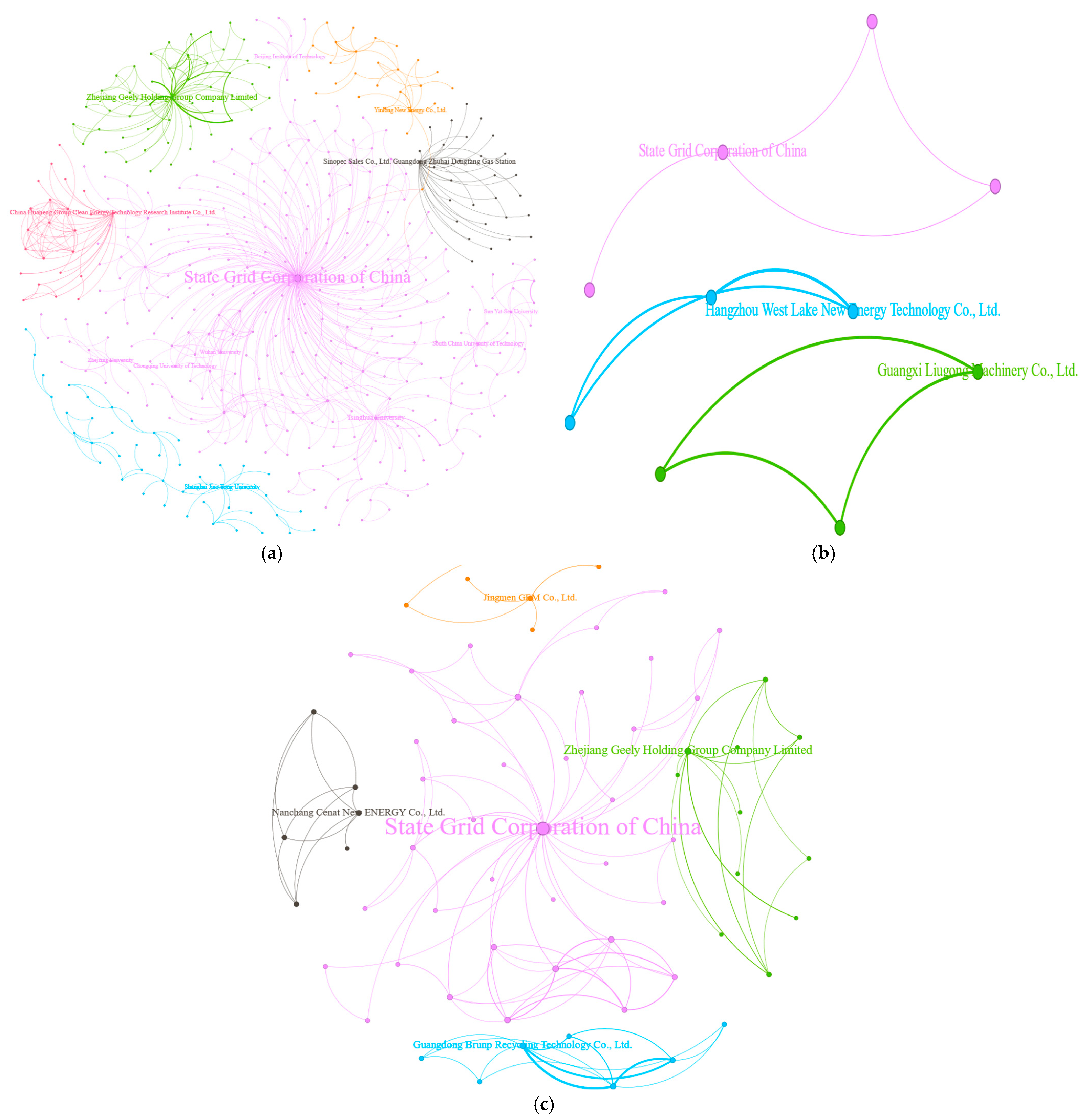 In terms of the divergent innovation patterns across the industrial chain segments, the component segment exhibits a dual structure that combines state-led collaboration and market-driven R&D. The complete vehicle segment persists as a tightly knit “exclusive club,” a structure defined by limited collaboration and intense internal competition. The aftermarket segment (e.g., battery recycling and reuse) forms specialized innovation clusters that are led by firms such as Brunp Recycling and GEM. Notably, the influence of the SGCC does not extend deeply into vehicle manufacturing, thereby revealing challenges in achieving full value chain integration.