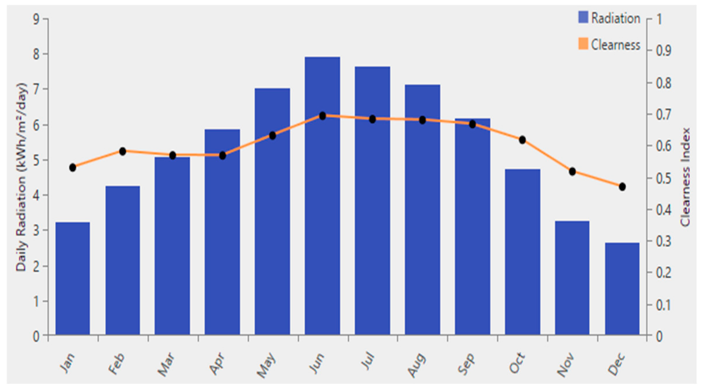 Table 2 summarizes the main technical and cost assumptions used for the BEIJIAYI 600 W solar PV modules, the AWS 5.1 kW wind turbine, and the 5 kW inverter. The BEIJIAYI monocrystalline PV modules were modelled with a nominal efficiency of 21.2%, temperature coefficient of −0.38%/°C, and a lifetime of 25 years.